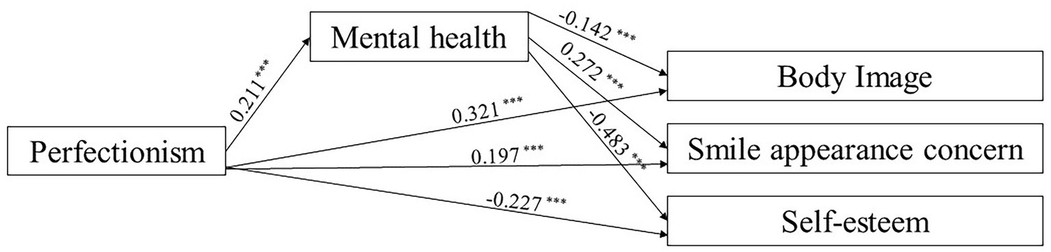 High perfectionism predicted higher self-perception of body image, and lower mental health and self-esteem in college students. Mental health could mediate the relationships between perfectionism and self-perception of orofacial appearance.