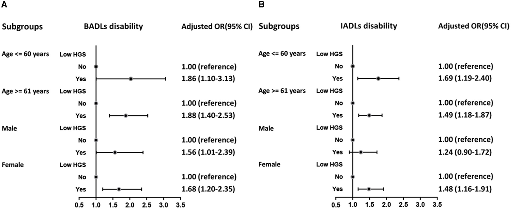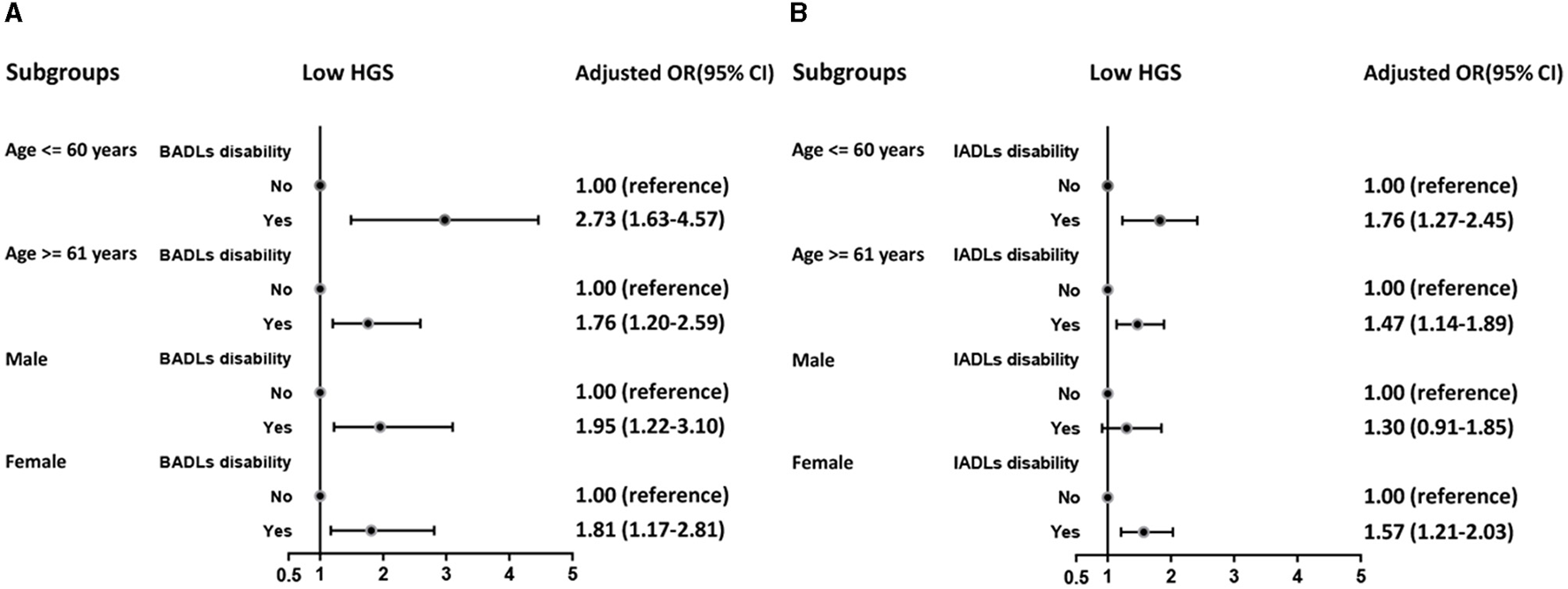 This study analyzed data from two waves (2011 and 2015) of China Health and Retirement Longitudinal Study (CHARLS). Low HGS is defined by the Asian Working Group for Sarcopenia criteria. Meanwhile, disability was assessed by ADLs scale. The prospective bidirectional association between HGS and ADL disability was examined using binary logistic regression. Subgroup analysis were performed according to age and gender.