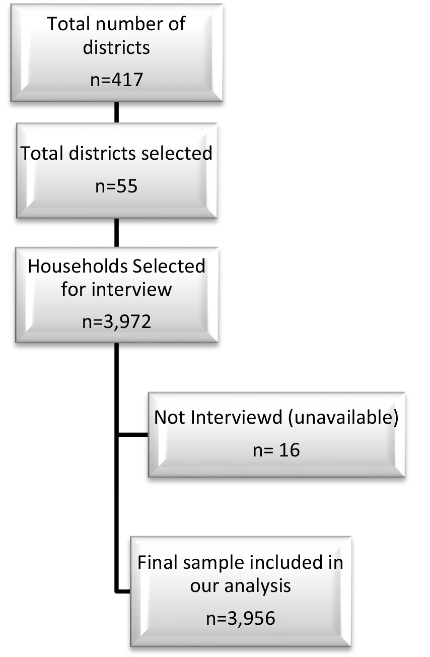 This analysis used secondary data from a national cross-sectional household survey in Afghanistan in 2018 (20). By using a multistage cluster approach, a nationally representative sample of individuals aged 18–69 years was generated (21). The primary sampling units were 55 districts randomly selected from 417 districts, followed by selection of households from these districts proportionate to the size of district (see Figure 1). One person from each household was randomly selected (21). The STEPS recommended 3 age groups per gender of 18–29, 30–44, and 45–69 years were used to calculate the sample size for the 6 different strata of populations. Using a confidence level of 95%, a margin of error of 5%, 0.5p, and 0.5q, the resulting sample size was 384. With a design effect of 1.5 and a non-response rate of 15%, the sample size was adjusted to 662 for each strata of the age-sex group. The adjusted sample size was multiplied by six gender groups (662*6) to get the final sample size of 3,972 households. In the end, 3,972 households (male and female) were selected for data collection in 55 randomly selected districts of Afghanistan. The dataset lacked 16 households, so the final sample size included in the analysis included 3,956 households (21).