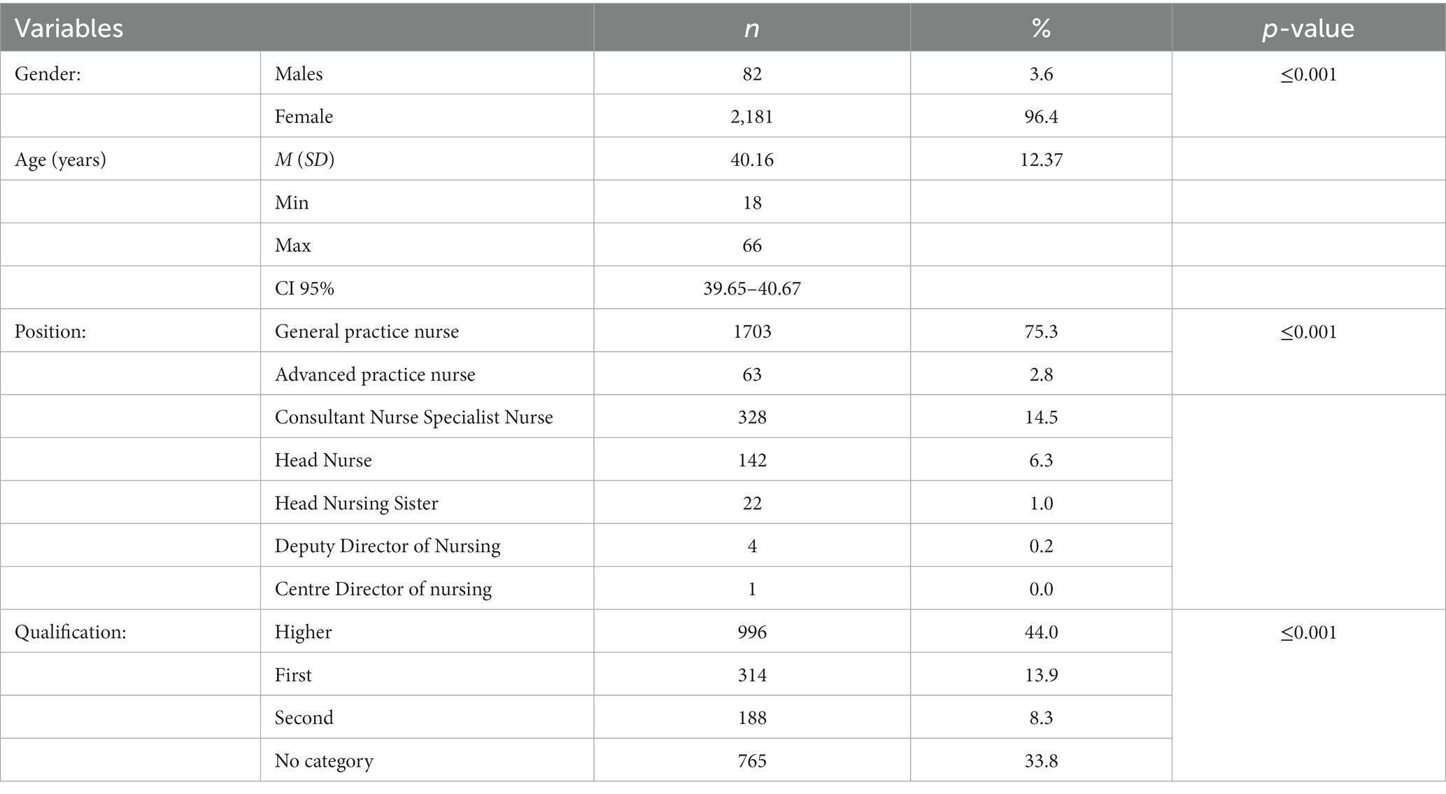 Out of 2,263 respondents 3.6% were male and 96.4% were female. 75.3% of respondents are nurse practitioners, 2.8% are specialized nurses. The highest qualification category has 44% of respondents (Table 1).