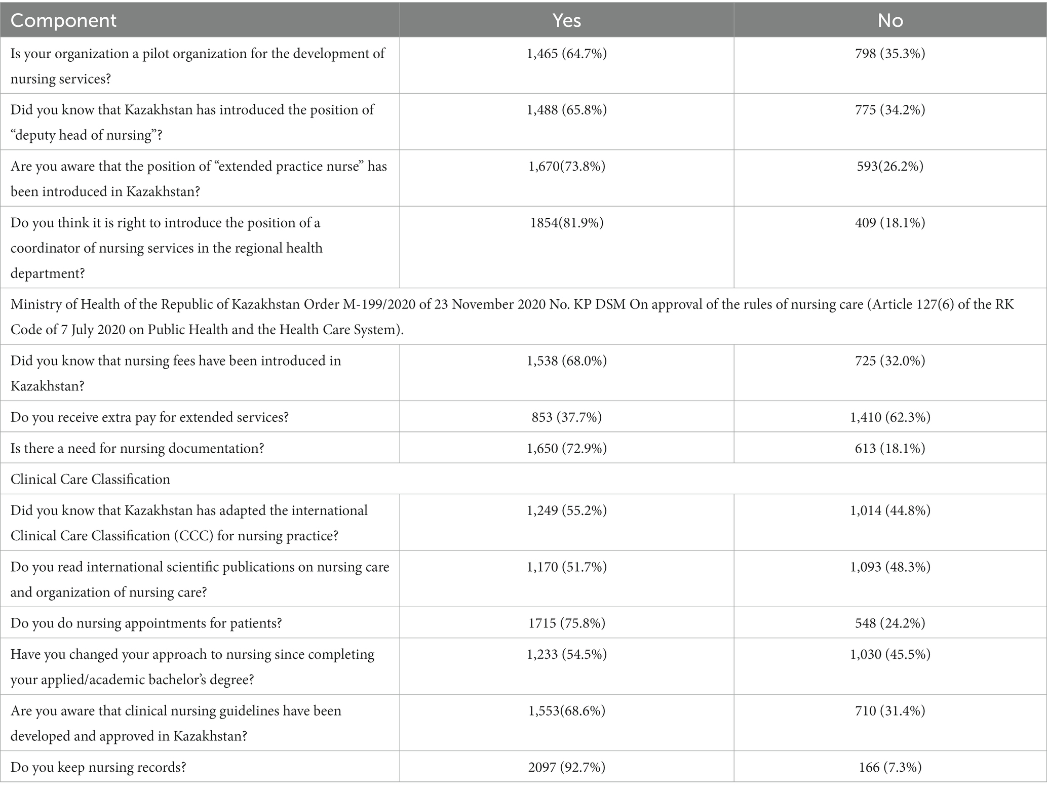 Data provides insights into participant awareness across several areas: 64.7% were aware of the pilot program for care services development, 65.8% knew about the introduction of the deputy head position, and 73.8% were familiar with the “extended practice nurse” role in Kazakhstan. Additionally, 81.9% opposed the introduction of a coordinator of nursing services at the regional health department, and 68% were aware of nursing tariffs. Most notably, 62.3% of participants did not receive extra payment for extended services, and 72.9% considered nursing documentation necessary (Table 2).