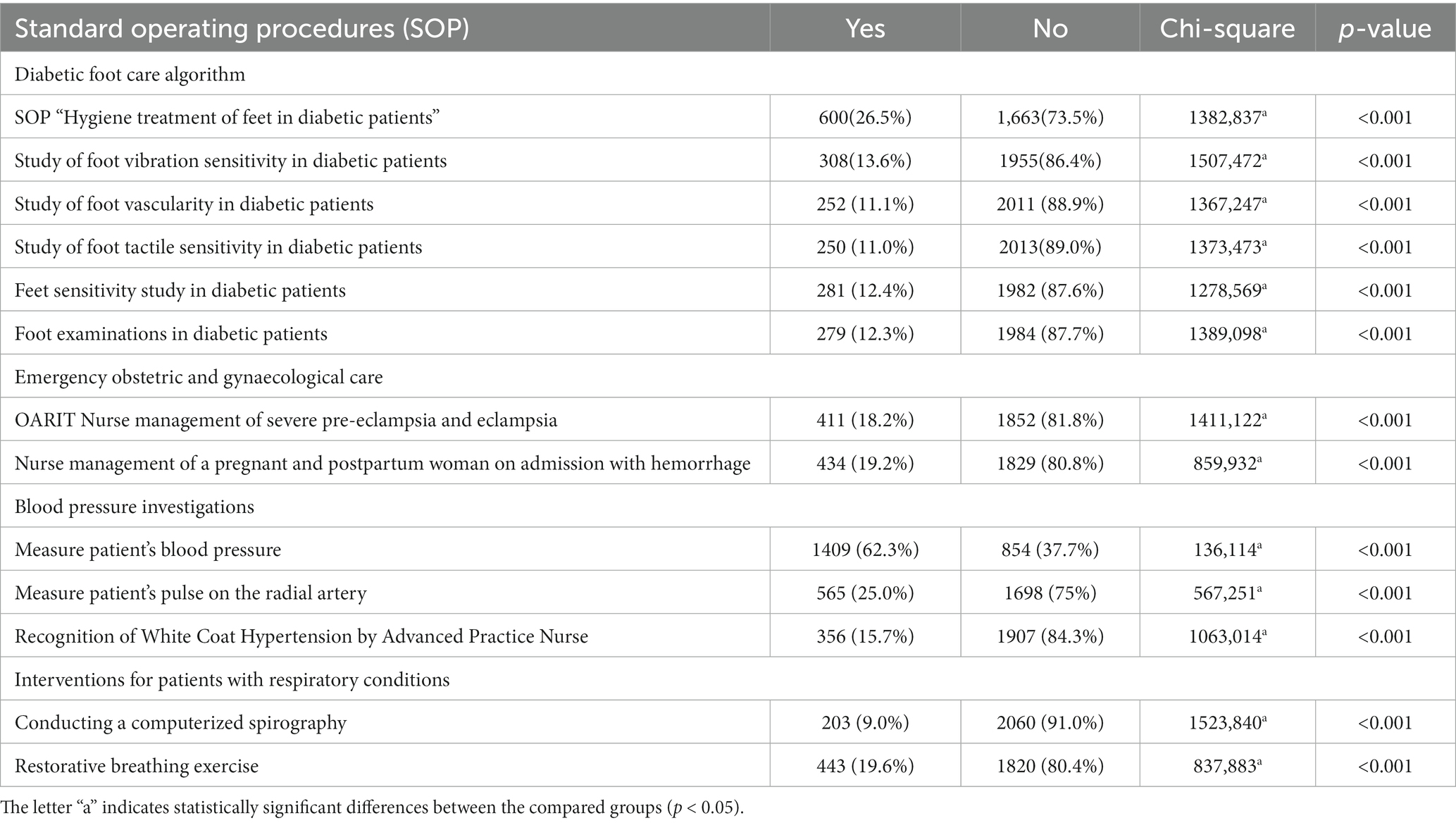 Results: In this cross-sectional study of 2,263 female nurses, 75.3% were nurse practitioners, and 44% held the highest qualification category. Awareness levels varied, with around 64.7% aware of the pilot program for care services, 65.8% aware of the deputy head position, and 73.8% familiar with the “extended practice nurse” role. Only 55.2% knew about the International Clinical Nursing Classification, and 54.5% observed changes in their nursing approach due to education. The limb edema measurement checklist was not used by the majority (88.4%) of respondents, and 68% did not utilize the antibiotic susceptibility testing checklist. Various other checklists and algorithms had limited utilization, with percentages ranging from 9.1 to 69.3%, indicating varying levels of adoption among participants. For assisting children with cerebral palsy, the “Assessment of hand use capacity according to the MACS classification system” was utilized by 9.1%, while 90.9% did not employ it. In the context of communication, 30.7% of the respondents utilized the “Algorithm of actions of a medical registrar when communicating with a patient,” while 69.3% did not use it. These findings highlight variable adoption rates among participants for these medical procedures and protocols.