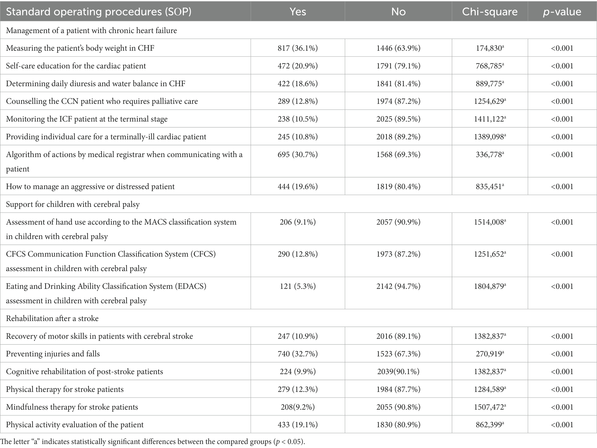 The frequency of utilization of standard operating procedures among the respondents for various clinical scenarios. In the management of patients with chronic heart failure, “Measuring the body weight of a patient with CHF” was used by 36.1% of the participants, while 63.9% did not utilize it. Self-care training for patients with CHF was utilized by 20.9% of the respondents, and 79.1% did not employ it. The procedure of “Daily diuresis and assessment of water balance in CHF” was used by 18.6% of the participants, with 81.4% not using it. For “Counselling a CCF patient in need of palliative care,” 12.8% of the respondents utilized it, while 87.2% did not employ it. Similarly, the procedure of “Monitoring the condition of a patient with CHF at the end of life” was used by 10.5% of the participants, and 89.5% did not utilize it. Providing individualized care for a patient with end-stage CHF was utilized by 10.8, and 89.2% did not utilize it (Table 6).