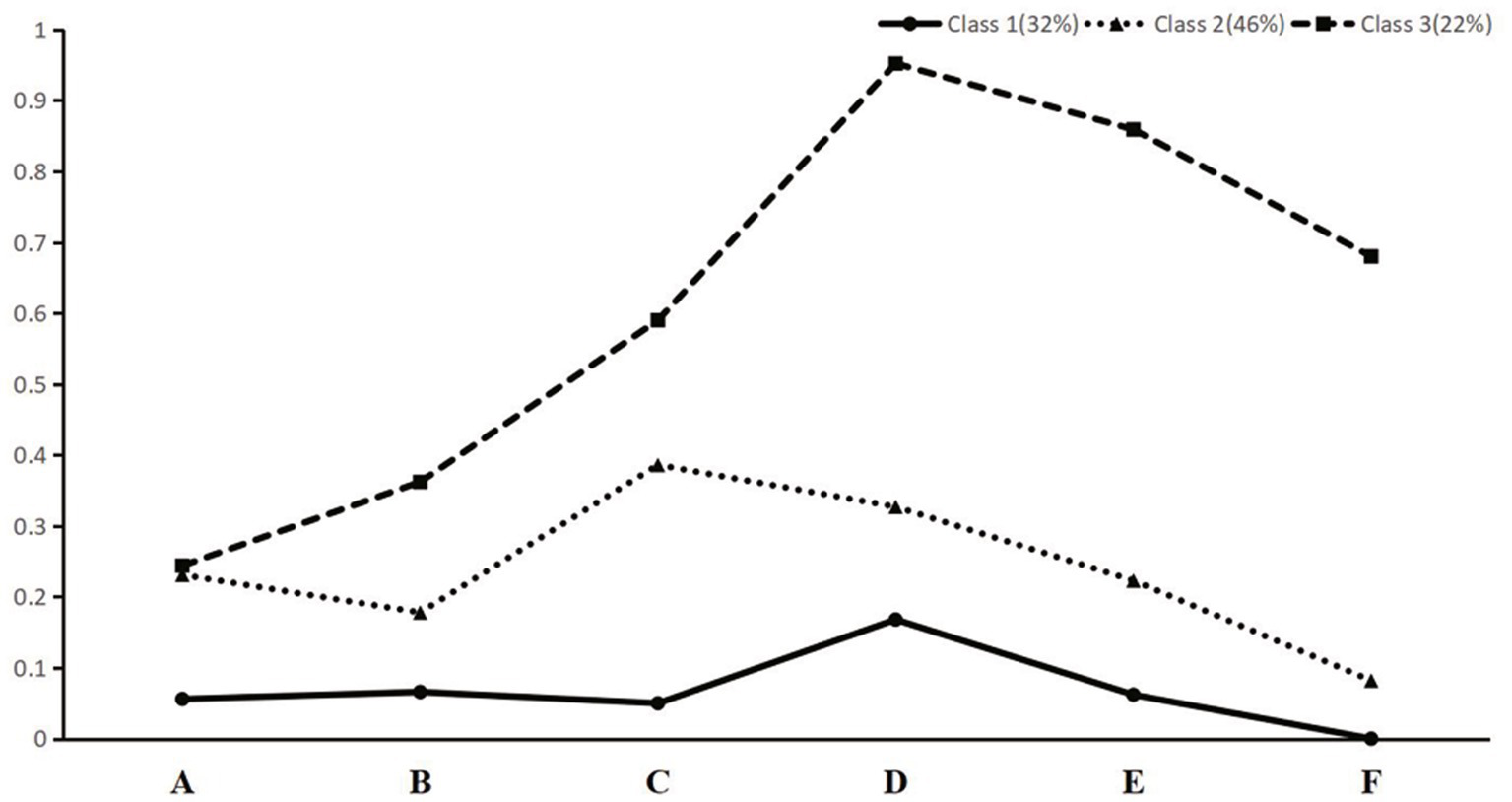 Table 2 shows the performance of latent class analysis (LCA) models with 1–5 classes. As Table 2 presented, the AIC was lowest when the number of classes was 5, the BIC was lowest when the number of classes was 3, and the aBIC was lowest when the number of classes was 4, however, the p value of the LMR was nonsignificant when the number of latent classes was four or five. Though the value of Entropy of three-class model was below 0.8 (0.756), it still beyond the criteria for good class separation cutoff point of 0.6 (36). Hence, the model with three groups was considered as the final model in this study. Figure 1 shows conditional probability distribution for the three classes of SWB, and Supplementary Table S2 shows the conditional probability of SWB indicators among three classes in detail (Supplementary Table S2). Using latent class analysis, we identified three SWB patterns: class 1, “very low SWB” (n = 112, 32% of the sample); class 2, “medium-low SWB” (n = 161, 46% of the sample); and class 3, “low evaluative and high affective SWB” (n = 77, 22% of the sample).