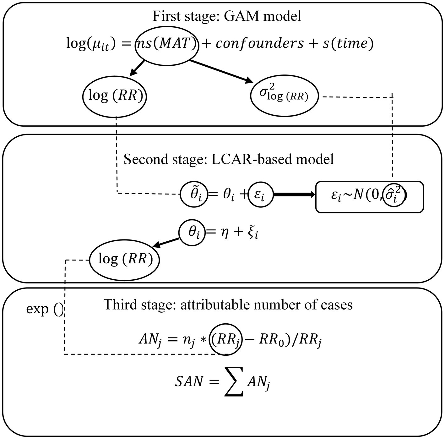 The latest proposed LCAR-based two-stage strategy (9) provided a reasonable method for mapping the spatially autocorrelated association. In contrast to the meta-analysis-based two-stage strategy, the LCAR-based strategy used the Leroux-prior-based conditional autoregression (LCAR) to replace the meta-regression in the second stage. This approach aims to sufficiently utilize the spatial dependence information. Many studies have demonstrated its capacity to accurately obtain short-term associations (10). In this study, based on the idea, an LCAR-based three-stage strategy was carried out to map the temperature-BD association, and then, the attributable BD burdens were calculated.