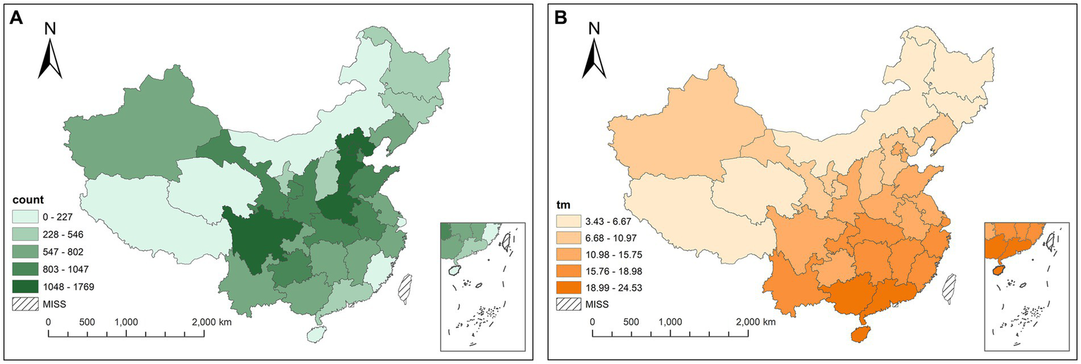 The monthly meteorological data were collected from the China Meteorological Data Sharing Service System,2 comprising average temperature (°C), mean relative humidity (%), average wind speed (m/s), sunshine duration (h), and average rainfall (mm). We utilized kriging interpolation within ArcGIS 10.2 (ESRI, ArcGIS 10.2, Redlands, CA, United States) to derive daily meteorological data for cities from cleaned weather station data. Subsequently, we computed monthly averages from these daily values. Finally, we applied a population-weighted average to calculate the provincial monthly meteorological data. The population-weighted formula for each province is defined as follows: