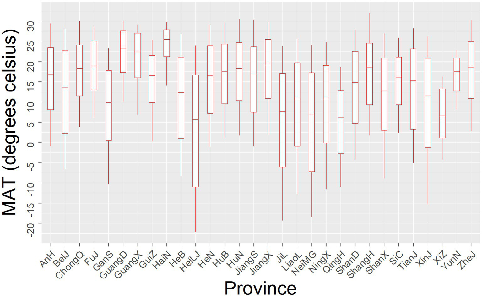 A total of 3,710,962 BD cases were reported from January 2004 to December 2017, with a monthly average of 71,255 cases. Figure 3A shows the spatial distribution of the monthly average cases. The largest number of cases recorded in 31 provinces is 297,249 (8%) in total and 1769.33 per month in Beijing, and the smallest is 12,333 (0.3%) in total and 73.41 per month in Hainan. In general, the cases are mainly concentrated in southeastern China, e.g., Sichuan and Henan, which reveals the spatial heterogeneity of the incidence of BD. Figure 3B shows the spatial distribution of the average MAT, which gradually increases from the north to south of China. The range of MAT of 31 provinces is shown in Figure 4. The minimum MAT of Hainan is 14°C, and the maximum MAT of Xizang is 16.3°C.