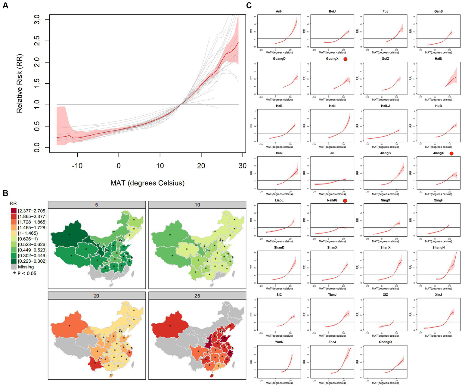 The curves of average association (A) and province-specific association between absolute MAT and BD (C) and spatial distribution of RRs of some representative absolute MAT, i.e., 5, 10, 20 and 25°C (B).