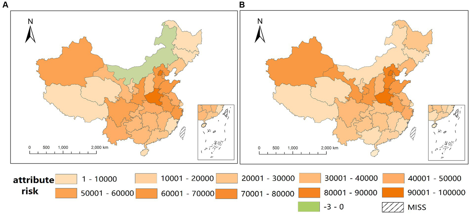 Based on more accurate and stable estimations of association, we calculate the attribute number (AN) of BD cases due to high temperature to evaluate the attribute risk and characterize its spatial distribution. As seen in Figure 6A, the spatial distribution of AN of the absolute MAT shows that high-burden regions are mainly distributed in the middle and eastern areas, which is opposite to the spatial distribution of RRs. This is because the AN depends on the RR and population, and the population distribution of China follows a pattern where the east is densely populated and the west is sparsely populated (27). Meanwhile, the attributed risk of Inner Mongolia is negative, which means a protective effect of high temperature. Figure 6B, depicting AN based on relative MAT, showcases a similar spatial distribution, albeit with Inner Mongolia’s AN at 9507, contrasting with Figure 6A. In addition, the ANs of some other provinces in Figure 6B are also larger than those in Figure 6A, which may be due to the underestimation of RRs caused by an inappropriate reference of 15°C.