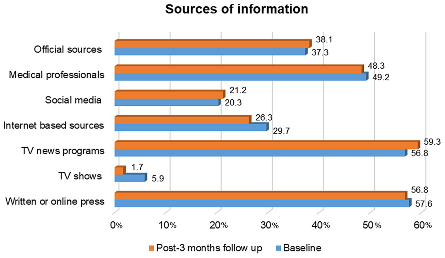 Finally, participants indicated whether they use certain media outlets as sources of information. The outlets included non-official sources such as news channels, written or online press and social media, and official sources including medical professionals, government briefs, and other official sources.