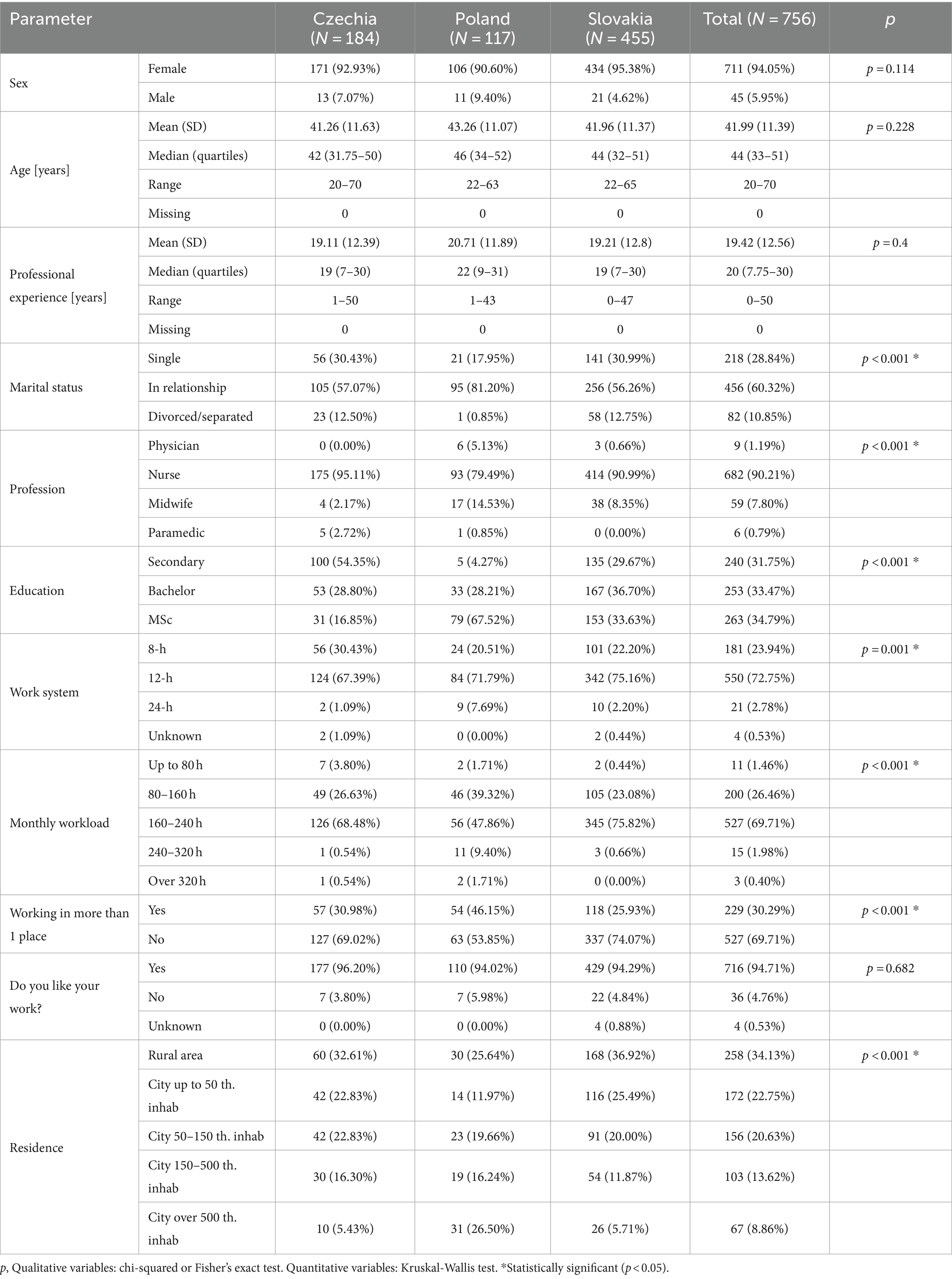 Females made up the majority of the study participants (94.05% female, 5.95% male). The majority of respondents were nurses (90.21%, p = 0.001) and had a mean age of 42 years, with approximately 12 years of work experience. In all three countries, the demographics of the respondents were the same. When taking the survey, the majority of those surveyed, which is 60.32% (p < 0.001), were already in a relationship. Nearly all the respondents had equivalent levels of education, with approximately 30% possessing a secondary education that includes a bachelor’s and a master’s degree. Polish participants had the lowest percentage of HCWs with secondary education (p < 0.001) compared to Czech and Slovakia. The reason for this is that nurses have not been educated at the secondary level for several decades. Currently, nursing education is offered at the bachelor’s and master’s levels. A total of 72.75 percent (72.75%, p = 0.001) work 12-h shifts and have a monthly workload of 160–240 h. The workload is consistent across all countries (p = 0.001). Our study shows that 46.15% of Polish healthcare workers work in two locations, which is the highest percentage among survived countries. Table 1 exhibits detailed socio-demographic information.