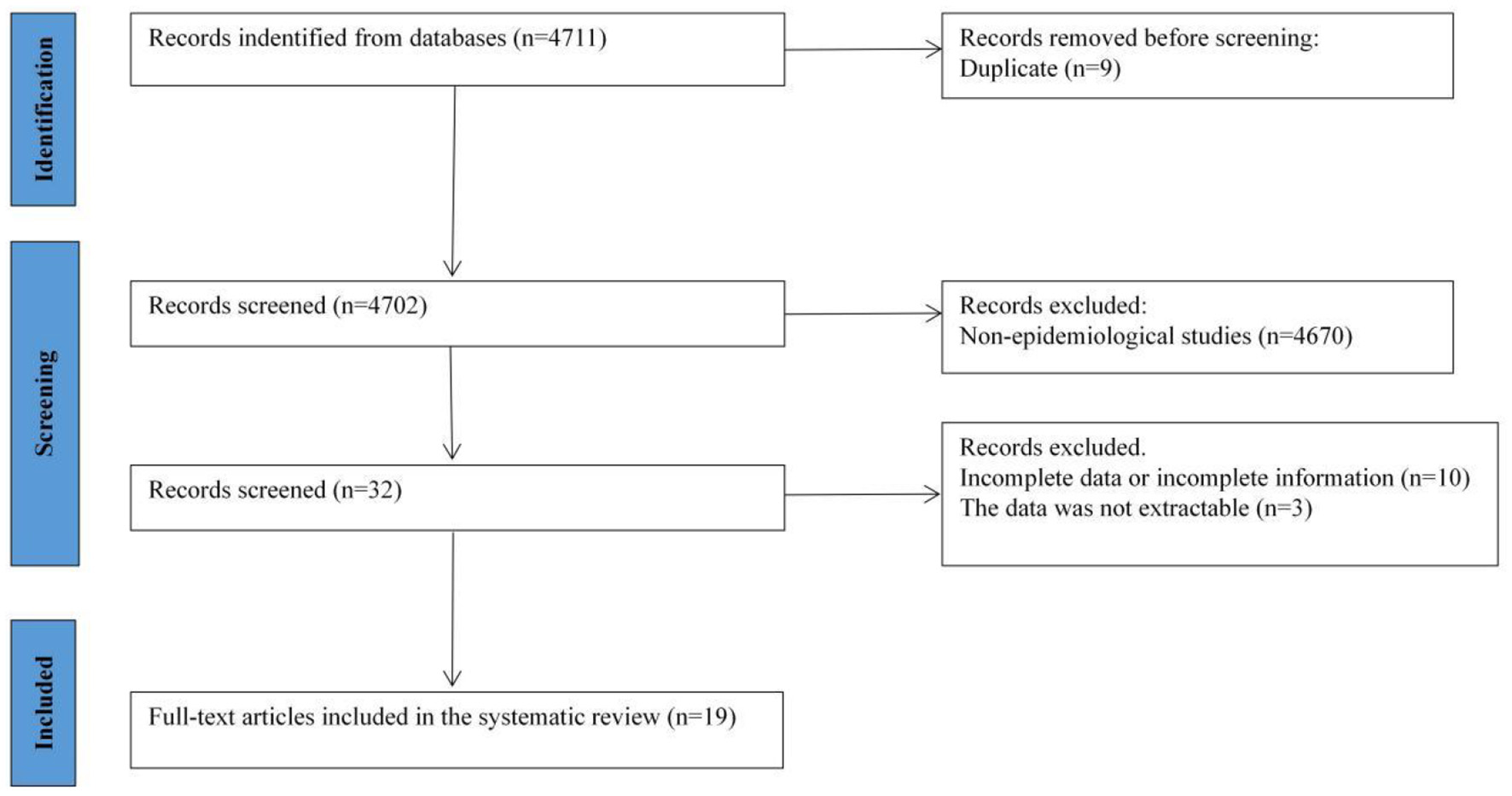 A total of 4,711 Chinese and English publications were identified using the database search strategy. After reviewing titles and abstracts, 32 publications were considered for full-text evaluation. After eliminating 13 publications with incomplete data or data that could not be extracted, 19 were included in the meta-analysis and data extraction (Figure 1). All included studies were single cross-sectional studies conducted from 1999–2023 with sample sizes ranging from 240–49,241. According to our criteria, all included publications with ≥5 points and could be included in the meta-analysis. A cross-sectional study was conducted for all publications and the prevalence of AD was calculated (Table 1).