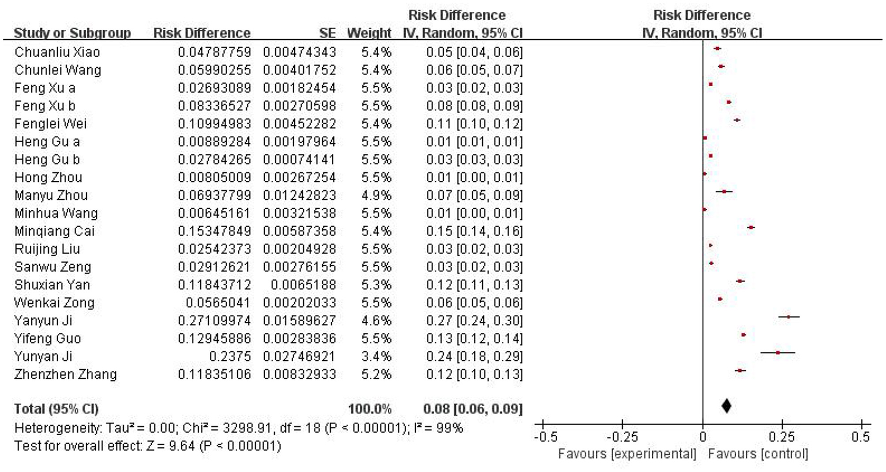 A random-effects model was used for the eligible studies. The meta-analysis was performed using Review Manager 5.3 (Copenhagen: The Nordic Cochrane Centre, The Cochrane Collaboration, 2014). Forest plots were used to summarize the estimates with 95% confidence intervals (CIs). The heterogeneity index among the included studies was determined using Cochran's Q test (chi-square test) and Higgins' I2 statistics. If the heterogeneity test showed P ≥ 0.1 and I2 ≤ 50%, this indicates homogeneity between studies, and the fixed-effects model can be used for combined analysis. P < 0.1 and I2 > 50% indicated heterogeneity between studies. Sensitivity analysis or subgroup analysis was then used to determine the source of heterogeneity. If the I2 statistic was significant (I2 > 50%), a random effects model was used; otherwise, a fixed effects model was used. Statistical significance was set at P < 0.05, and a 95% CI was reported.