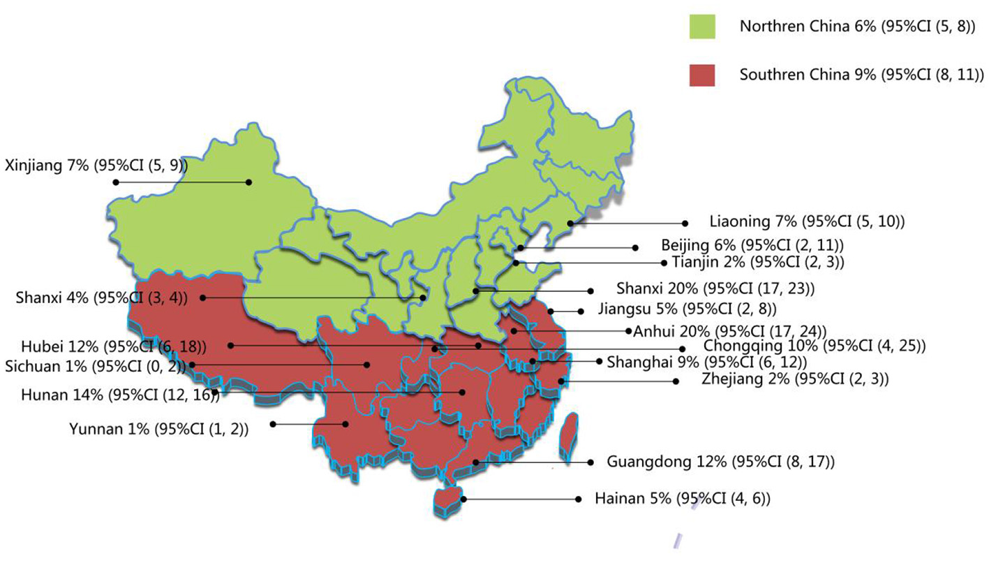 The 19 publications included in this study had a total sample size of 127,660 cases, of which 7,470 were positive cases. The pooled prevalence of AD in children aged 1–7 years in China was 8% (95% CI, 6–9) (Figure 2). Among the 19 studies, there were 9 studies from 1999 to 2012, and the estimated prevalence was 6% (95% CI, 4–8). There were 10 studies between 2013 and 2023, with an estimated prevalence of 10% (95% CI, 7–13). The results showed that the total prevalence in children aged 1–7 years in China during 2013–2023 was higher than that before 2013 (Table 2). In addition, samples were collected from 17 of China's 31 provinces, as other provinces lacked valuable or available epidemiological data on AD prevalence. At the provincial level, the results showed an estimated prevalence of 20% in Zhejiang, Shanxi, and Anhui, which was the highest among the 17 provinces. The remaining 14 provinces, from high to low, followed by Hunan (14%), Hubei (12%), Guangdong (12%), Chongqing (10%), Shanghai (9%), Xinjiang (7%), Liaoning (7%), Beijing (6%), Jiangsu (5%), Hainan (5%), Shanxi (4%), Tianjin (2%), Yunnan (1%), and Sichuan (1%). These provinces were further divided into southern and northern China based on the geographical definition of China along the Qinling–Huai River line. In terms of geographical distribution, the prevalence rates in southern and northern China were 9% and 6%, respectively (Table 2, Figure 3).