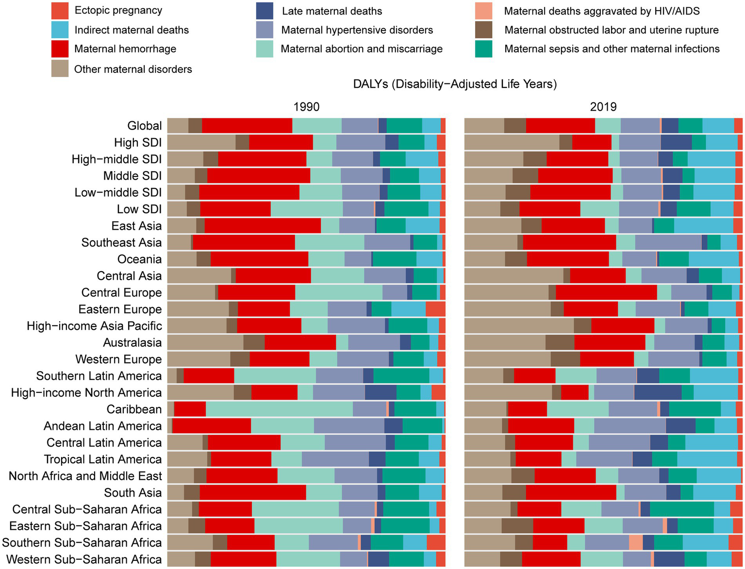 Between 1990 and 1999, the proportion of maternal abortion and miscarriage in the age-standardized DALYs of maternal disorders due to iron deficiency decreased across GBD regions. Meanwhile, the proportions of Indirect maternal deaths and Other maternal disorders increased (Figure 2) among most of regions. Additionally, we can see that maternal hemorrhage and Other maternal disorders account for a larger proportion of the DALYs of 10 maternal disorders associated with iron deficiency. In 1990, East Asia and South Asia had relatively higher proportions of maternal hemorrhage, but by 2019, these proportions had decreased, while in Central Europe it increased. Meanwhile, the proportion of maternal deaths aggravated by HIV/AIDS increased proportionally globally and across different SDI levels, with the most significant increase observed in Southern Sub-Saharan Africa. The proportion of late maternal deaths increased globally and across all five SDI levels, with the most significant increase observed in High-income North America.