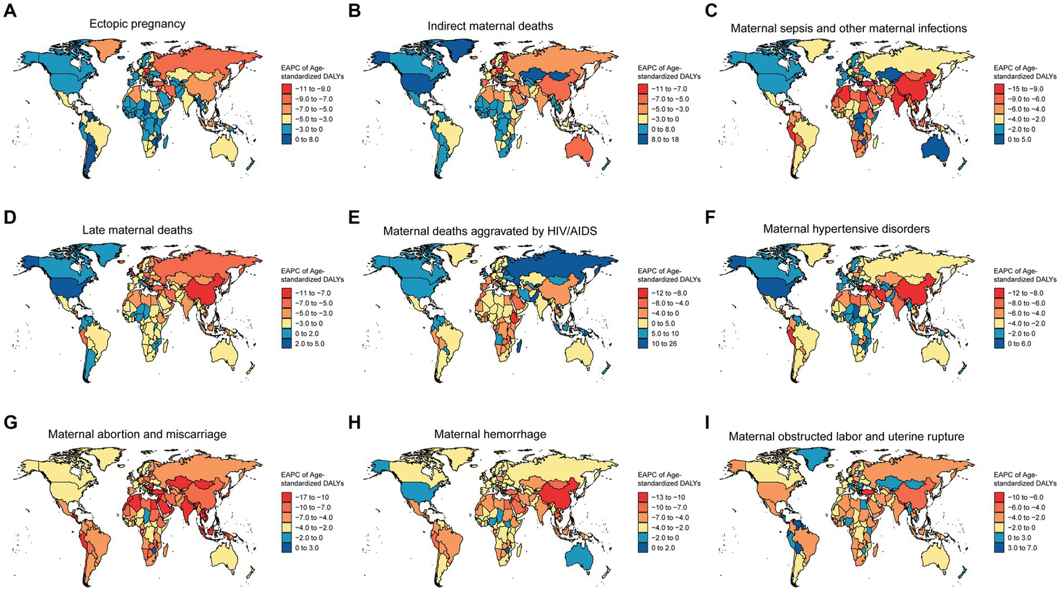 The EAPC of age-standardized DALYs for maternal disorders caused by iron deficiency across 204 countries. (A) The EAPC of age-standardized DALYs for ectopic pregnancy caused by iron deficiency across 204 countries. (B) The EAPC of age-standardized DALYs for indirect maternal deaths caused by iron deficiency across 204 countries. (C) The EAPC of age-standardized DALYs for maternal sepsis and other maternal infections caused by iron deficiency across 204 countries. (D) The EAPC of age-standardized DALYs for late maternal deaths caused by iron deficiency across 204 countries. (E) The EAPC of age-standardized DALYs for maternal deaths aggravated by HIV/AIDS caused by iron deficiency across 204 countries. (F) The EAPC of age-standardized DALYs for maternal hypertensive disorders caused by iron deficiency across 204 countries. (G) The EAPC of age-standardized DALYs for maternal abortion and miscarriage caused by iron deficiency across 204 countries. (H) The EAPC of age-standardized DALYs for maternal hemorrhage caused by iron deficiency across 204 countries. (I) The EAPC of age-standardized DALYs for maternal obstructed labor and uterine rupture caused by iron deficiency across 204 countries.