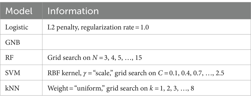 After the acoustic and linguistic features were extracted from the speech data, they were used to train machine learning models. The machine learning classifiers we used include Logistic Regression (Logistic), Random Forest (RF), Support Vector Machines (SVM), Gaussian Naïve Bayesian (GNB), and k-Nearest Neighbors (kNN). The models are summarized in Table 7. For the RF, SVM, and kNN classifier, we applied grid search on the following parameters: for the RF, the number of estimators N; for the SVM, the kernel regularization parameter C; for the kNN, the number of neighbors k. The ML classification was implemented using Python (version 3.9.12) toolbox sklearn (57).