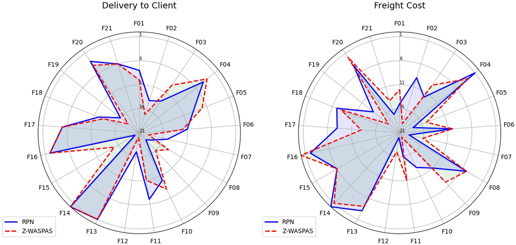 This section outlines the hybrid ranking methodology, which integrates Z-DEA-FMEA with Z-SWARA and Z-WASPAS to provide a comprehensive prioritization of failure modes across two objectives: Delivery to Client Date and Freight Cost (74). The process combines three rankings: RPN (Table 15), Z-SWARA/Z-WASPAS (Table 5), and Z-DEA-FMEA efficiencies (Table 14). The scores are normalized and aggregated into a hybrid score for each failure mode 𝑖 using Equation 21: