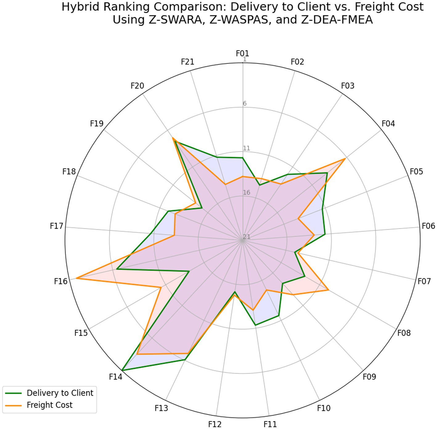 Figure 3. Hybrid rankings based on Delivery to Client date vs. freight cost using Z-SWARA, Z-WASPAS, and Z-DEA-FMEA.