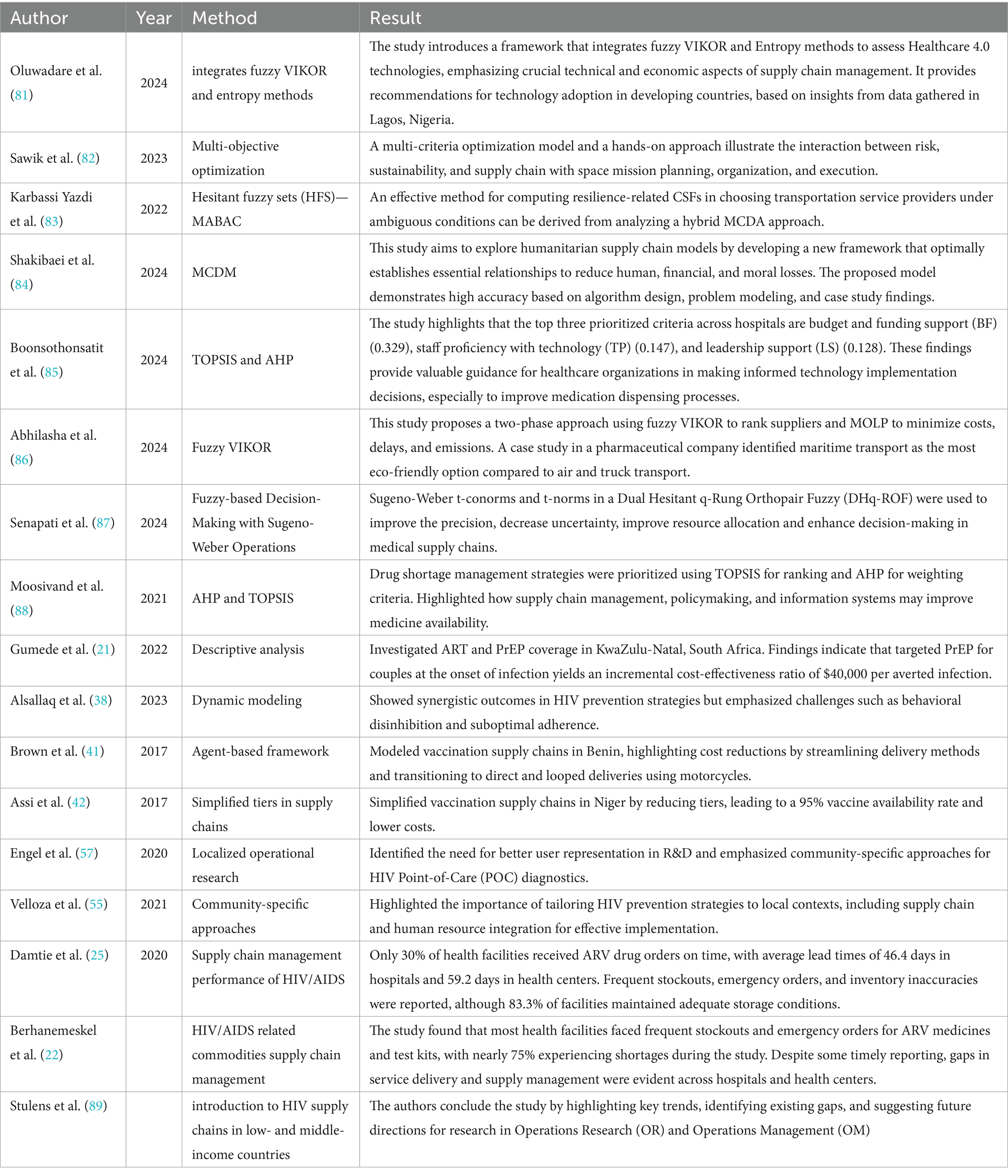 Table 1. Review of related methods and contextual literature on multi-criteria decision-making in healthcare and supply chain.