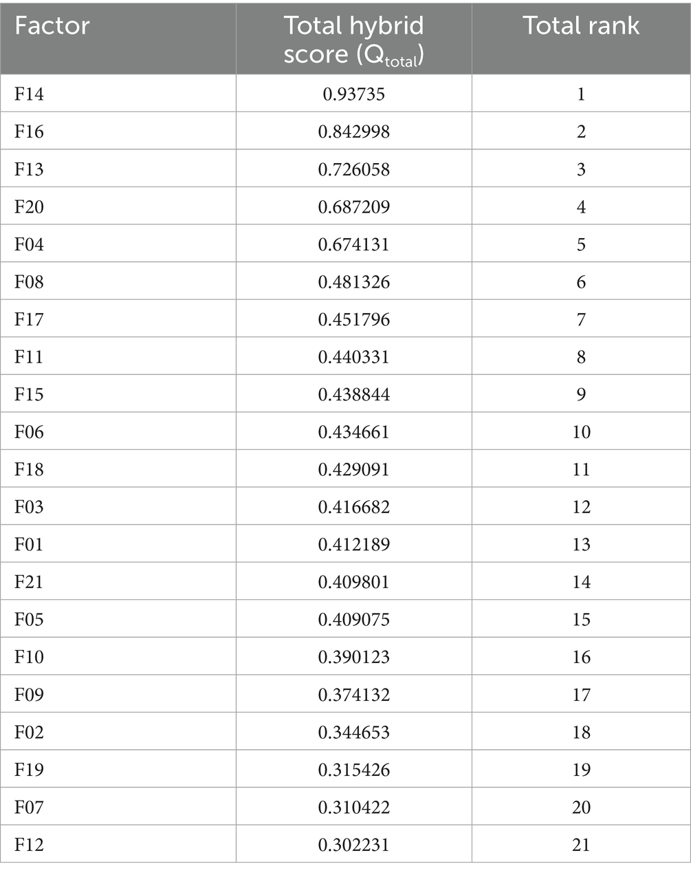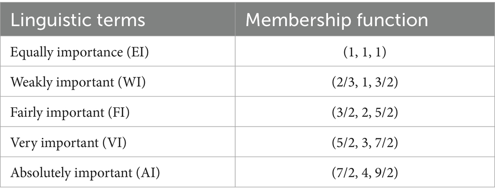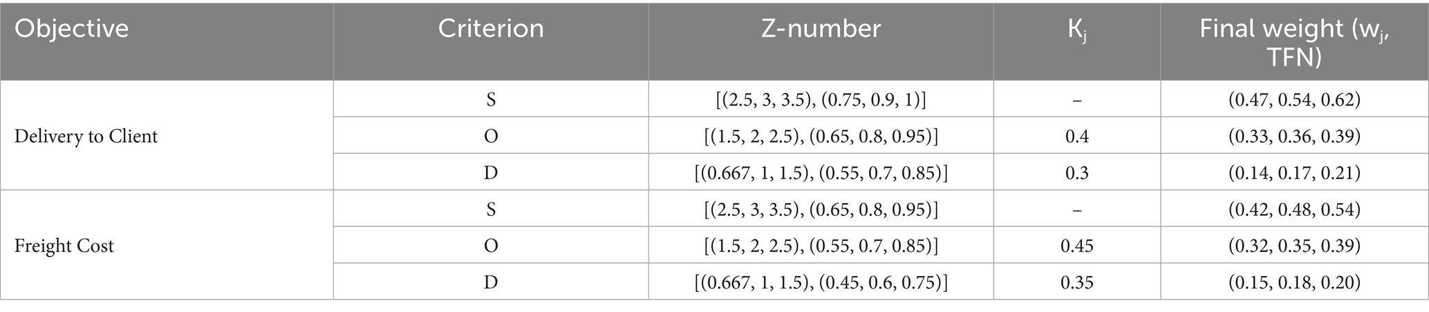 The Stepwise Weight Assessment Ratio Analysis (SWARA) method, introduced by Kersuliene et al. (68), determines criteria weights through expert judgments in a structured manner. Fuzzy SWARA extends this by using Triangular Fuzzy Numbers (TFNs) to handle uncertainty in expert opinions. In this study, we further extend fuzzy SWARA to Z-SWARA by incorporating Z-numbers, which add reliability to the weight assessment process, enhancing the credibility of the results (69). Experts compare criteria step-by-step, assigning relative importance based on the cumulative influence of preceding criteria. The resulting weights (Table 4) are used in Z-WASPAS (Table 5) and hybrid rankings (Tables 6–8). The Z-SWARA method involves the following steps: