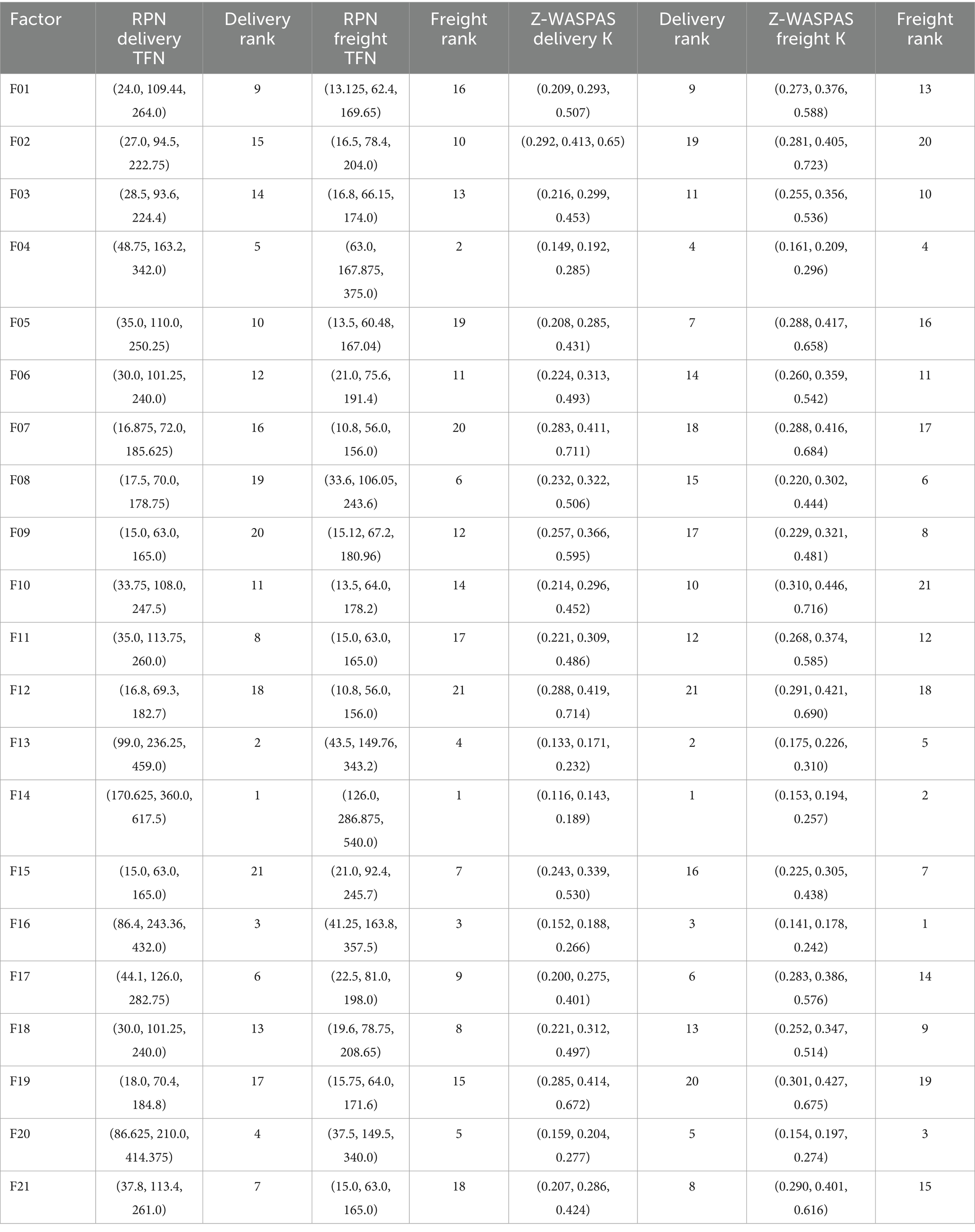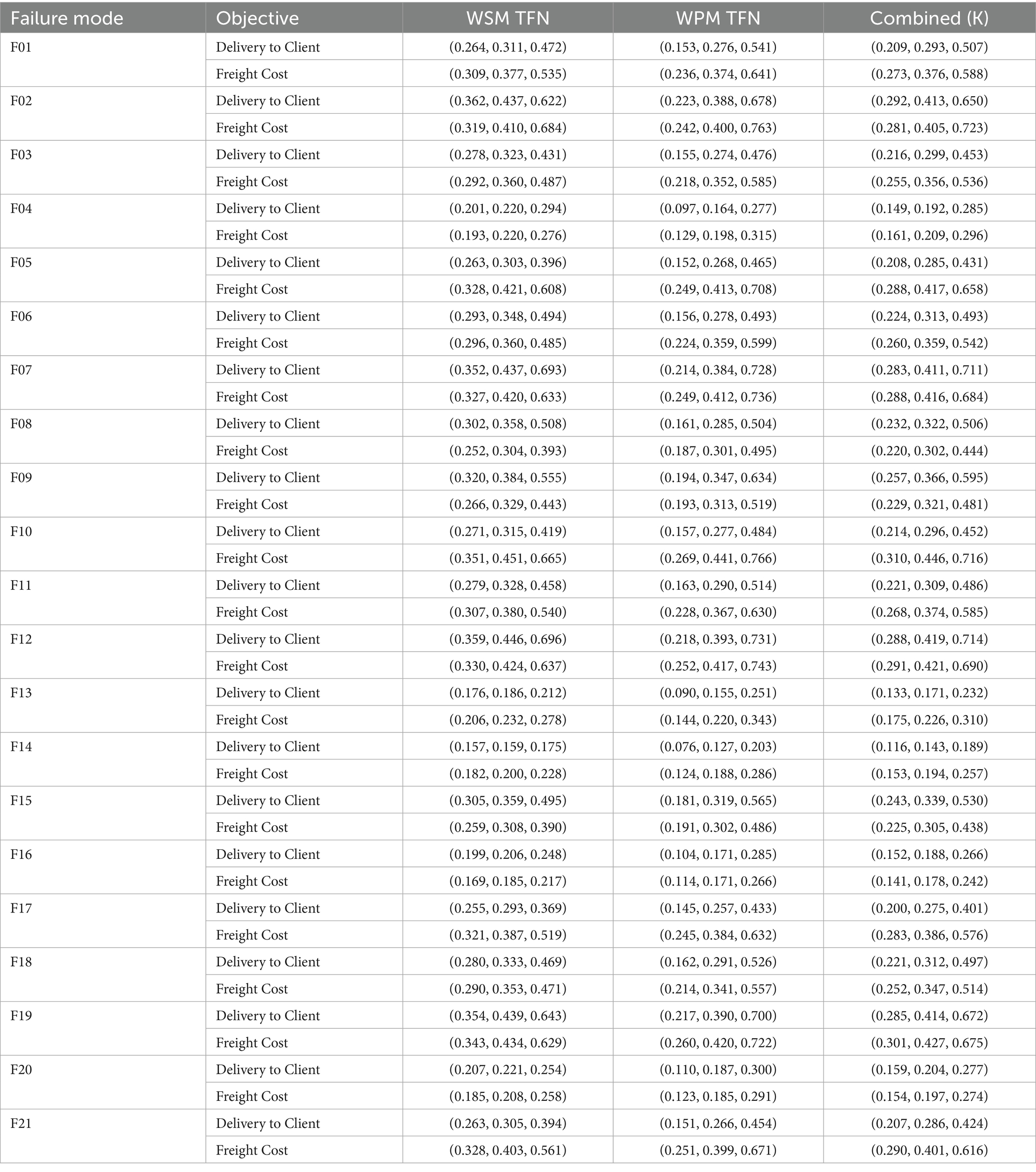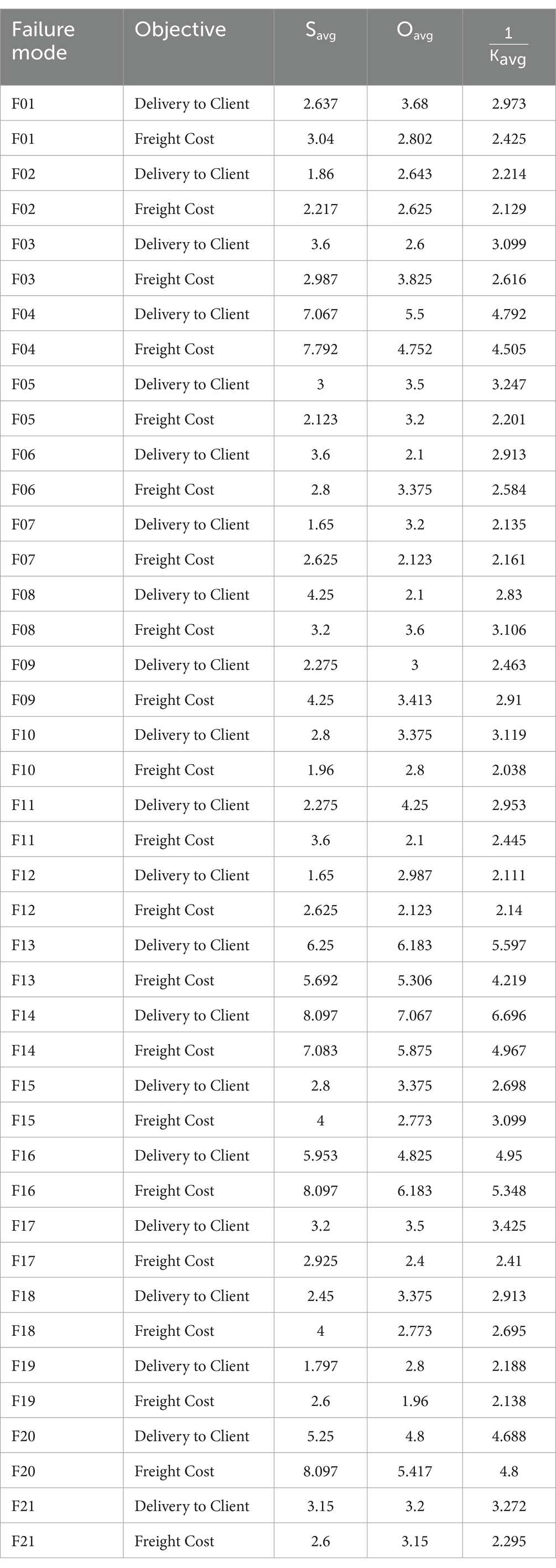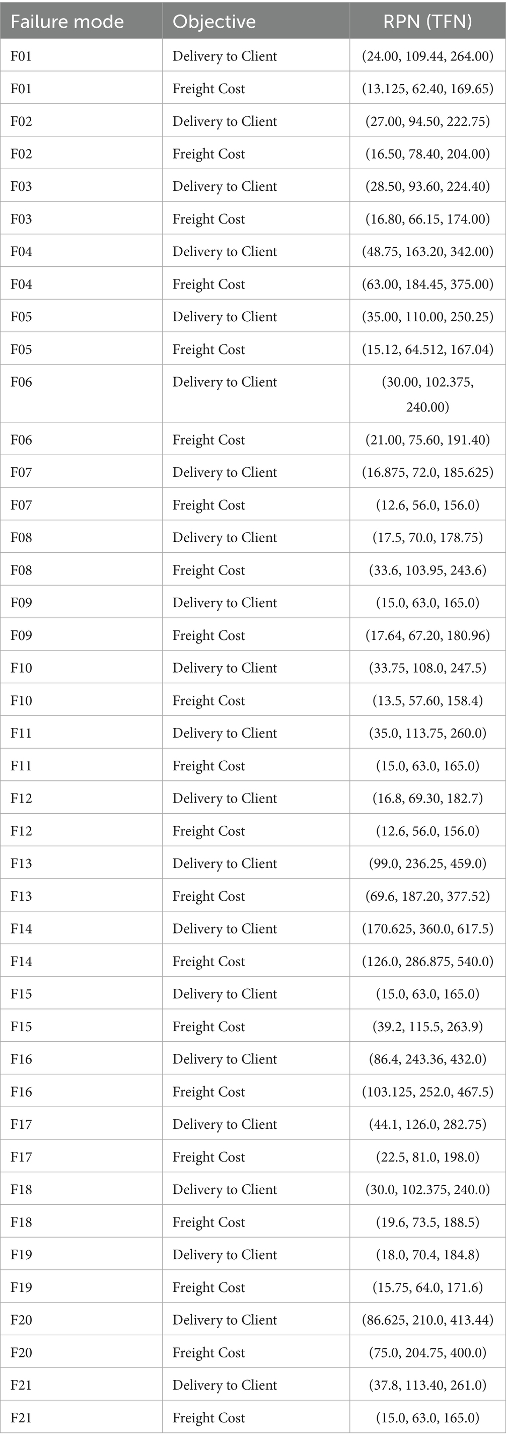 Failure Mode and Effect Analysis (FMEA) serves as an effective tool for predicting potential system failures and preventing their occurrence. It has also been widely applied in healthcare settings to enhance safety and reliability (75). In this study, focusing on optimizing the HIV drug supply chain, FMEA is employed as the first step to identify risks (76, 77). Twenty-one failure modes that occurred in the ARV and HIV lab supply chain have been identified through a literature review, analysis of the dataset, and finalized approval by experts (78), with their risk factor values determined as Z-numbers, as shown in Table 13. These failure modes, assessed across two components: Delivery to Client Date and Freight Cost (USD) are introduced as follows: “Country Infrastructure” (Country Infrastructure Challenges, F01), “Coordination Failures” (Coordination Failures by Manager, F02), “INCO Term Misalignment” (Vendor INCO Term Misalignment, F03), “Shipment Mode Selection” (Inefficient Shipment Mode Selection, F04), “Delivery Scheduling” (Inaccurate Delivery Scheduling, F05), “Storage Conditions” (Improper Storage Conditions, F06), “Dosage Errors” (Dosage Specification Errors, F07), “Molecule Mismatch” (Molecule/Test Type Mismatch, F08), “Vendor Reliability” (Vendor Reliability Issues, F09), “Brand Delays” (Brand Availability Delays, F10), “Delivery Confirmation” (Delayed Delivery Confirmation, F11), “Product Misclassification” (Product Group Misclassification, F12), “Unit Miscalculation” (Unit of Measure Miscalculation, F13), “Quantity Errors” (Line Item Quantity Errors, F14), “Customs Delays” (Customs Clearance Delays, F15), “Pack Price Discrepancies” (Pack Price Discrepancies, F16), “Demand Forecasting” (Inaccurate Demand Forecasting, F17), “Site Distance Delays” (Manufacturing Site Distance Delays, F18), “First Line Delays” (First Line Designation Delays, F19), “Weight Failures” (Weight-Related Logistical Failures, F20), “Insurance Overruns” (Line Item Insurance Cost Overruns, F21). For brevity, we refer to these failure modes by their short names (e.g., “Country Infrastructure”) throughout this study, with brief designations provided in Table 17. The decision matrix, converted to Z-numbers using Tables 9, 10 (section 3), is presented in Table 13.