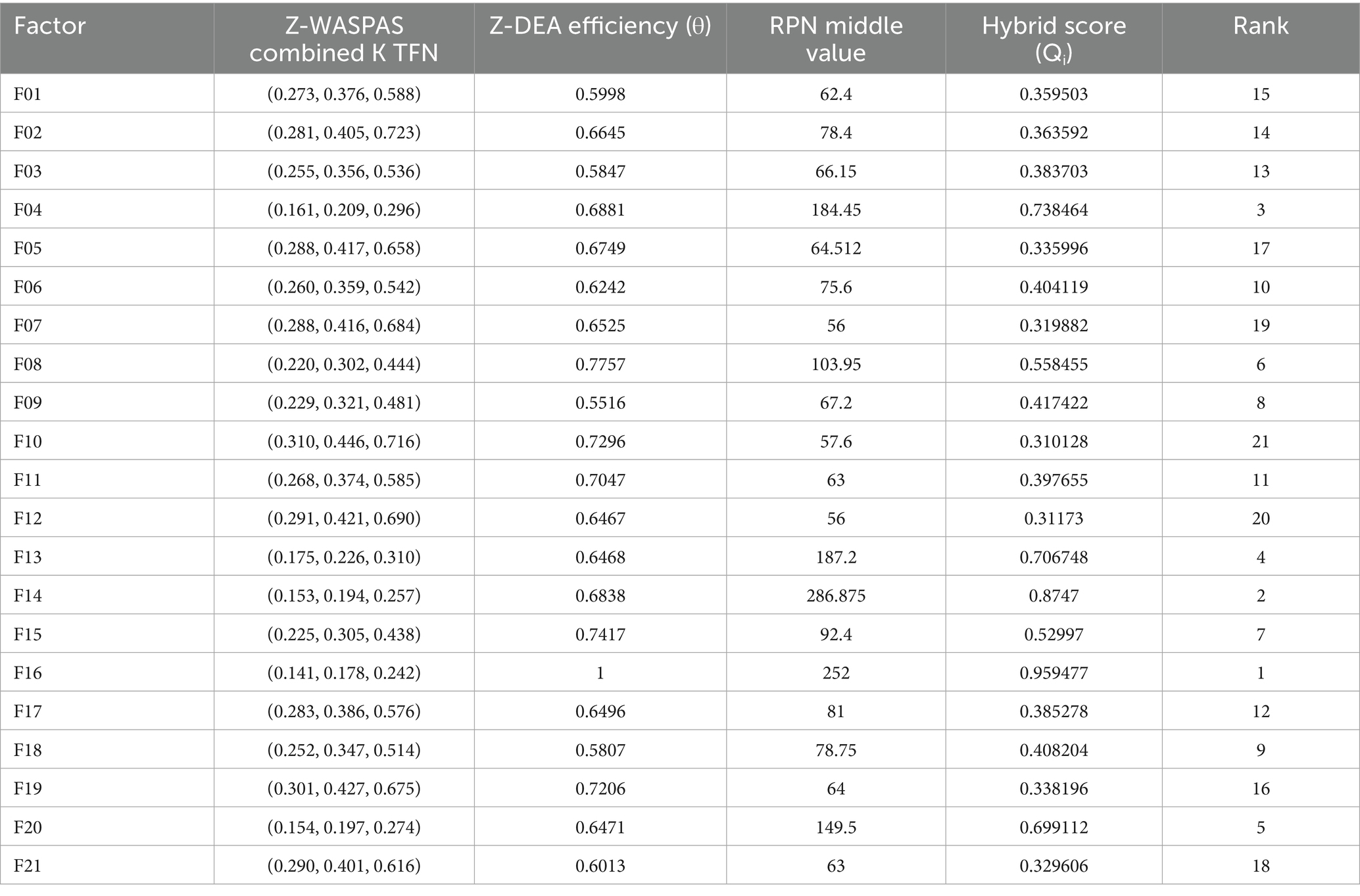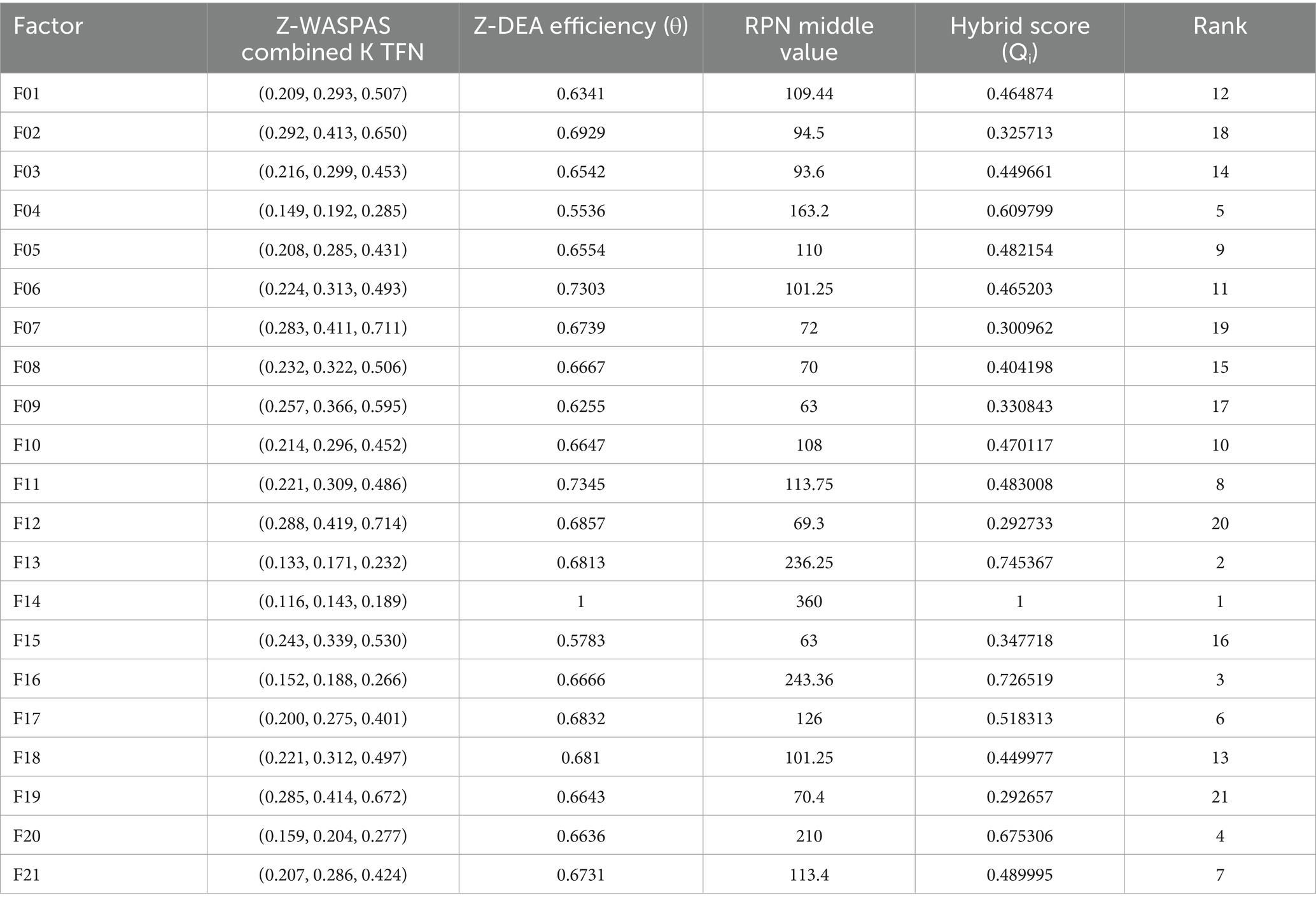 The Weighted Aggregated Sum Product Assessment (WASPAS) method, introduced by Zavadskas et al. (70), combines Weighted Sum Model (WSM) and Weighted Product Model (WPM) scores for multi-criteria decision-making. Fuzzy WASPAS extends this by using TFNs to handle uncertainty (71). In this study, we further extend fuzzy WASPAS to Z-WASPAS by using Z-SWARA weights (Table 4), which incorporate reliability via Z-numbers (69). Z-WASPAS ranks failure modes based on their risk impact (Severity, Occurrence, Detection), with WSM and WPM scores (Table 5) used in Z-DEA-FMEA (Table 12) and hybrid rankings (Tables 6–8). The Z-WASPAS method involves the following steps:
