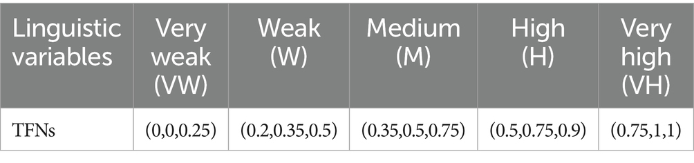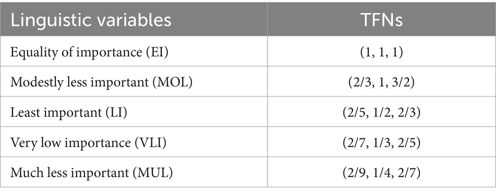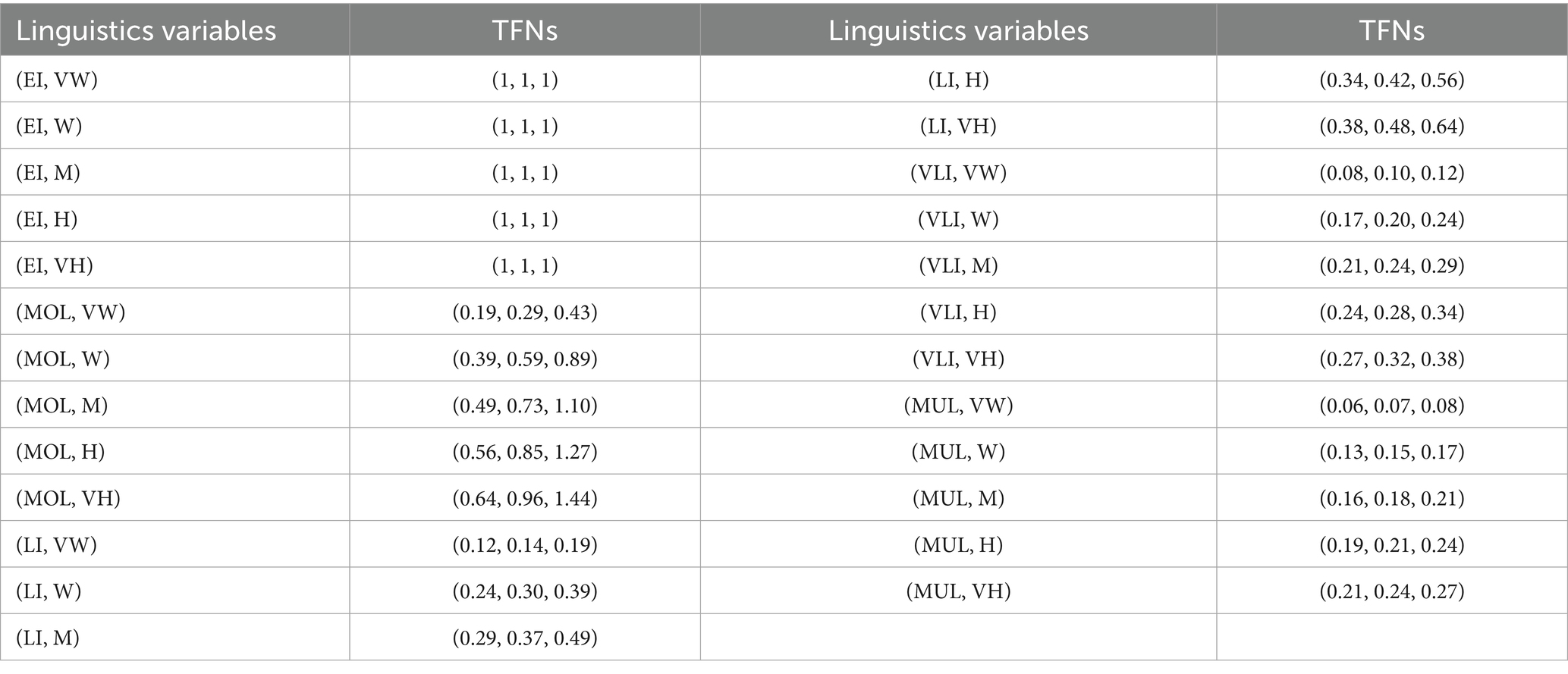Table 11. In order to determine weighting criteria, Z-numbers are transformed to TFNs based on linguistic characteristics.