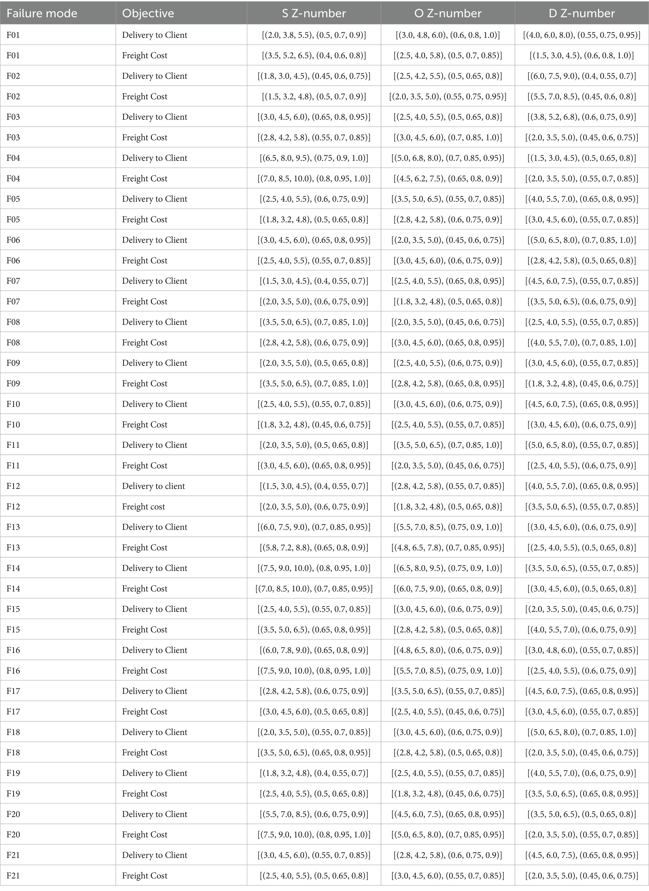 It is important to note that the HIV drug supply chain is a multifaceted system that is affected by a number of factors. The delivery and distribution of essential medical supplies may be adversely affected by each variable. Understanding and mitigating these risks becomes essential for the efficient and reliable operation of the supply chain. Various variables, ranging from F01 to F21, are assessed using the Failure Modes and Effects Analysis (FMEA) method. In order to assess each variable, three dimensions are considered: severity, occurrence, and detection, rated by experts for both Delivery to Client Date and Freight Cost objectives. In mathematics, Z-numbers represent both deterministic information and uncertainty associated with that information (69). To provide a range of possible values for each variable, two sets of Z-numbers are presented.