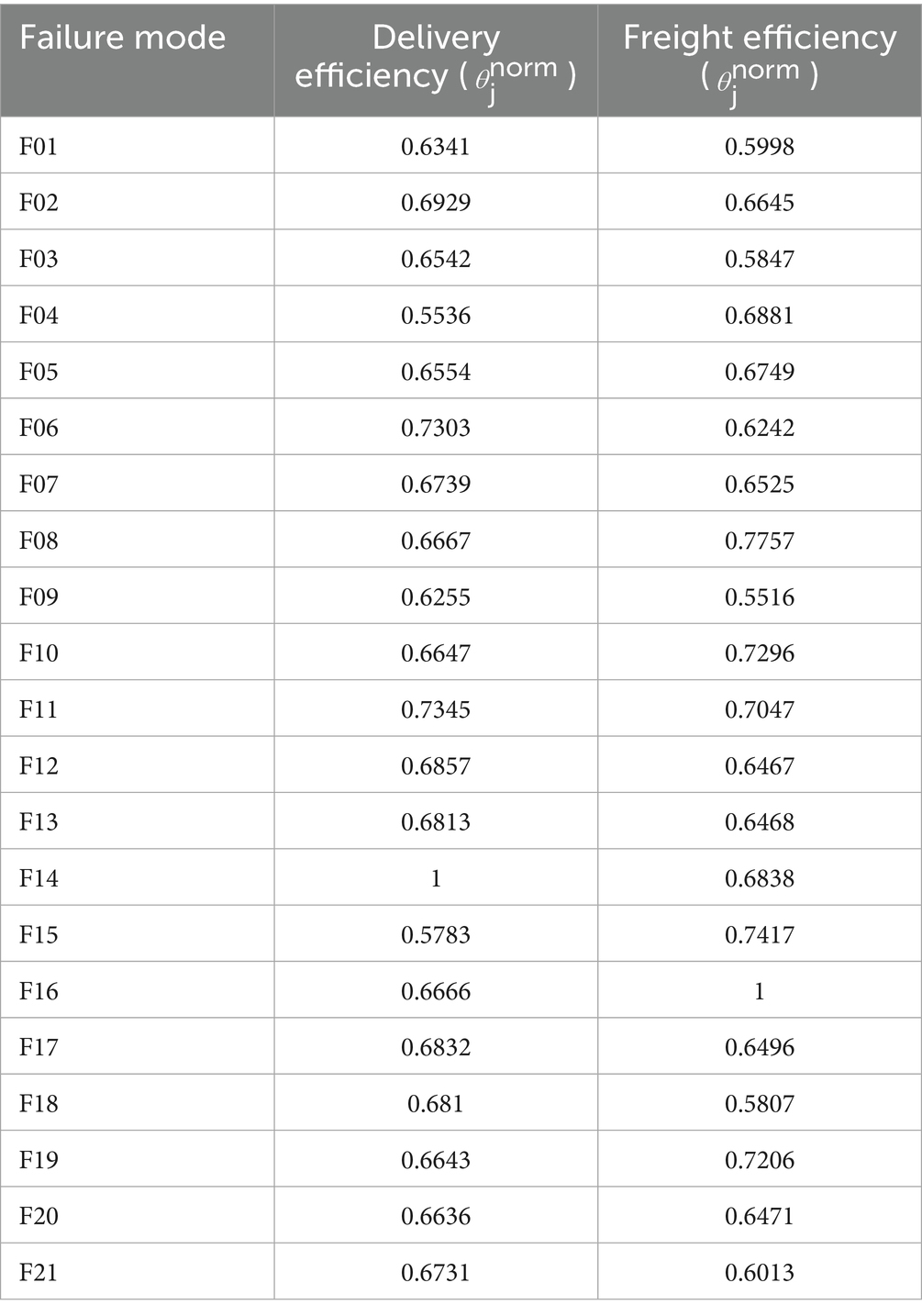 where 𝑥𝑖𝑗 is the 𝑖-th input (S or O) for mode 𝑗, and 𝑦𝑗 is the output (𝐾), with 𝑙, 𝑚, and 𝑢 as lower, middle, and upper TFN bounds. These averages (𝑆𝑎𝑣𝑔, 𝑂𝑎𝑣𝑔, 𝐾𝑎𝑣𝑔) are detailed in Table 12 for all modes. This study uses 1/𝐾avg scores as the output (low 𝐾𝑎𝑣𝑔 values indicate high risk due to non-beneficial criteria S, O, D), so high 1/𝐾𝑎𝑣𝑔 values reflect greater criticality) for Z-DEA-FMEA. To achieve robust differentiation among failure modes, super-efficiency DEA with Variable Returns to Scale (VRS) was employed using the “sdea()” function in “RStudio” (72). This method enhances standard DEA by allowing efficiency scores to exceed 1 for highly efficient modes, addressing the need for clear prioritization in supply chain risk management (73). The super-efficiency model is formulated as Equations 16–20: