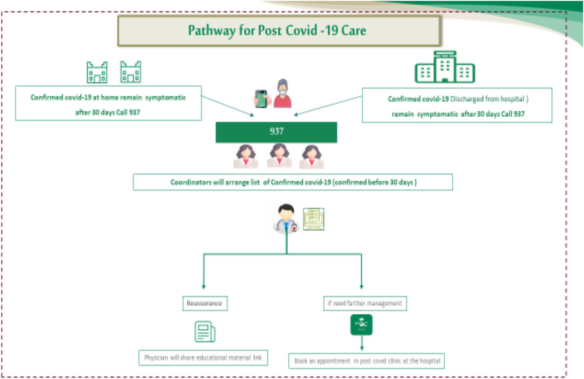 Through Ma’uad (an active referral system) for post-COVID-19 care, either to primary health care centers (PHCCs) the closest of the 2,400 PHCCs or to post-COVID-19 clinics in hospitals across the 20 health regions in SA (either attendance, no-show, or cancel the appointment).