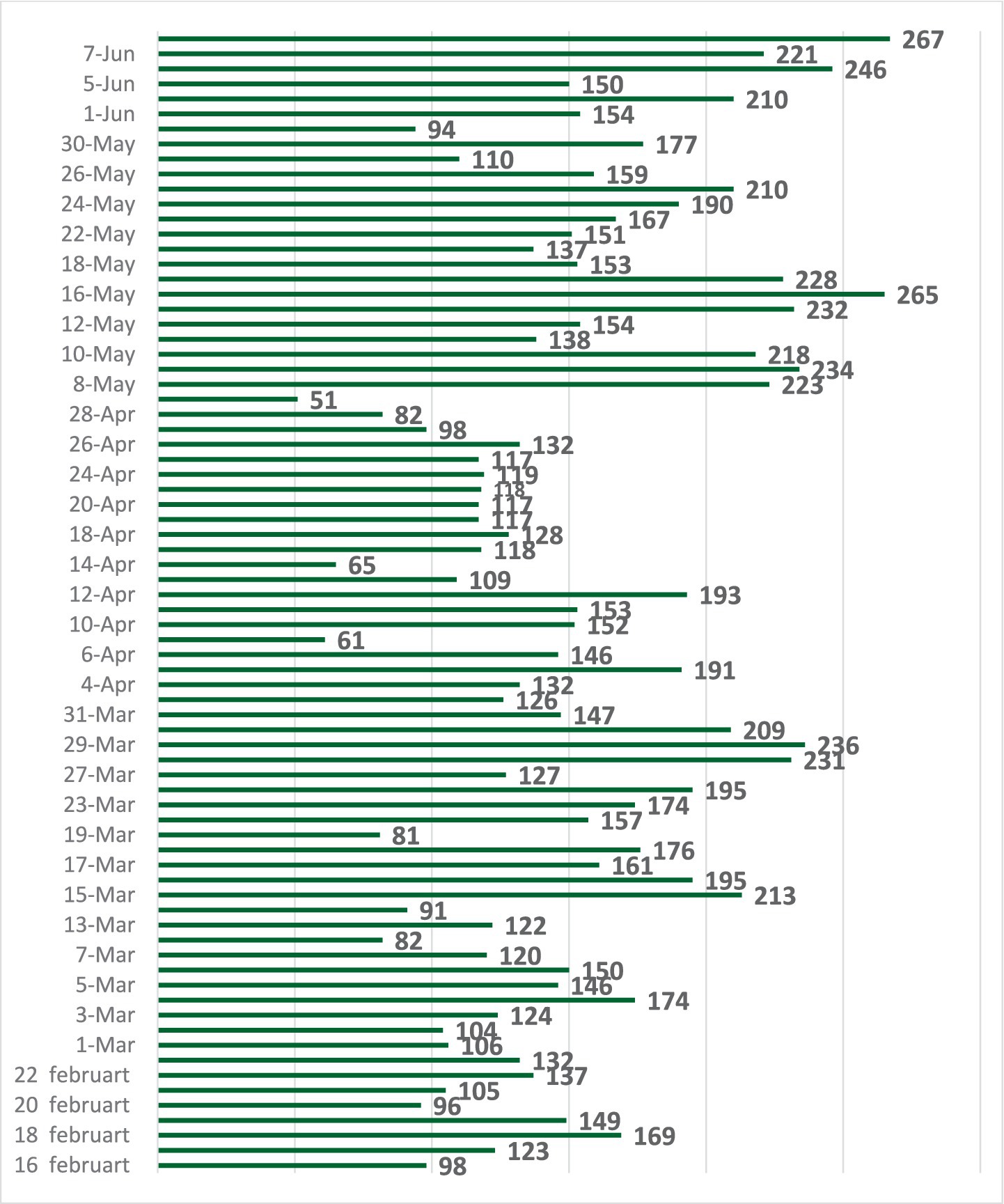 The response rate to the virtual assessment response: Across the 14 weeks of the study, the median number of calls per week was 177, which varies across different weeks and ranges from 98 to 276 calls per day (Figure 2). Out of the 12,125 registries that received the virtual assessment calls, only 5,913 (48.8%) agreed and completed the survey; 5,451 (45.1%) did not answer; 314 (2.6%) refused to complete the virtual assessment; 230 (1.9%) asked to call at another time; 205 (1.7%) were wrong numbers; and 12 (0.1%) died. Therefore, we limited the analyses to this final sample of 5,909 (48.8%) (Figure 3).
