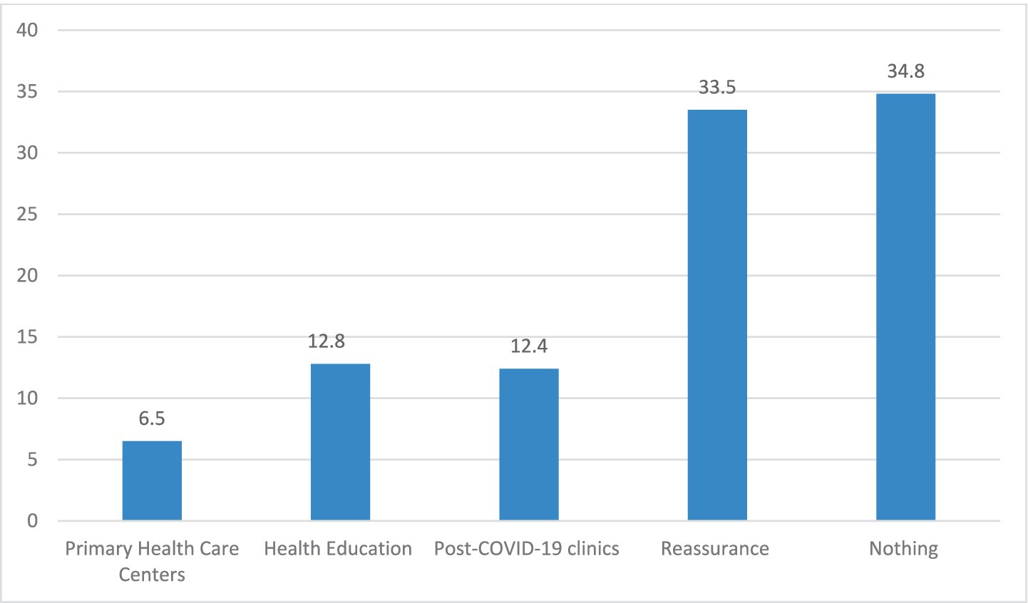 Nothing; Reassurance: Reassure them that support will continue to be provided as new information emerges; Clinical Education: Advise cases in which PCCs are not yet well understood and continue to discuss progress and challenges and reassess goals as necessary. Frequently, after COVID-19, symptoms were not explained by or out of proportion to objective findings and should not be dismissed, even if there is not yet a complete understanding of their etiology or severity; Referral: to a dedicated clinic in Ma’uad through an active referral system for post-COVID-19 care either to the nearest one from the 2,400 primary healthcare centers (PHCCs) or to post-COVID-19 clinics in hospitals all over the 20 health regions all over the SA.