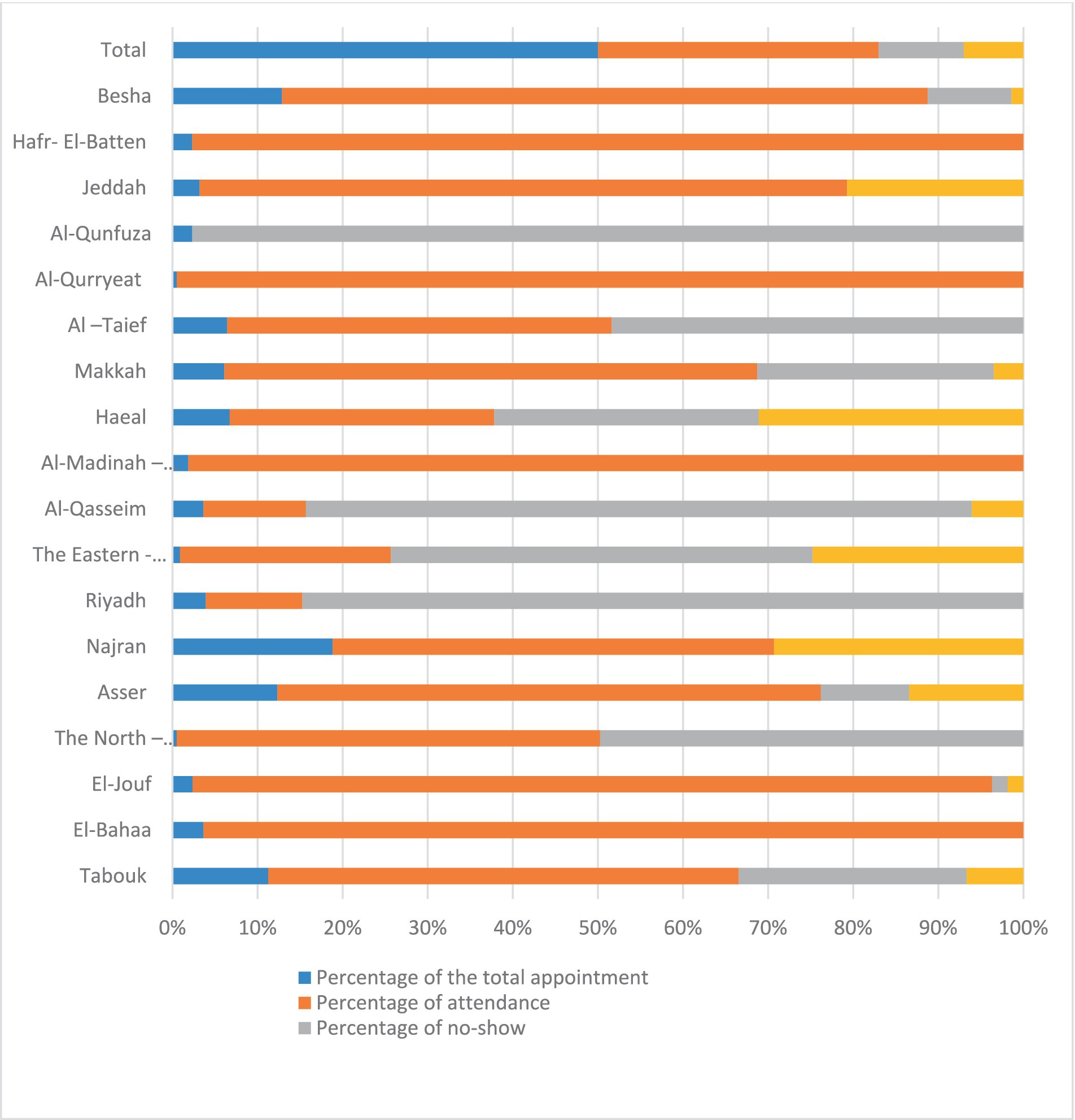 Figure 5. The total number of referral appointments, the attendance, the no-shows, and the canceled ones across the 20 health regions in SA.