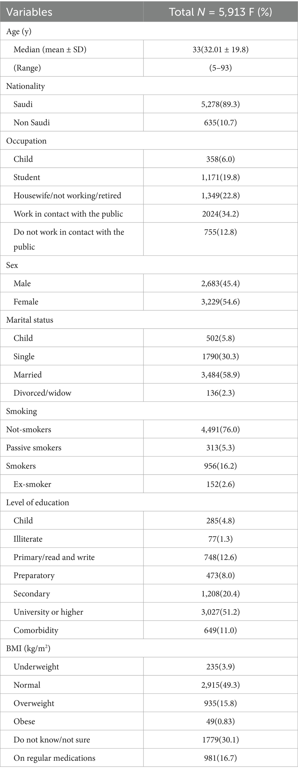 Concerning COVID-19 cases’ general and demographic characteristics (Table 1): Among the 5,913 participants who accepted the virtual assessment, the following demographics made up the majority: 74.5% were between the ages of 18 and 65; 54.6% were women; 89.3% were Saudis; 58.9% were married; 34.2% worked in public service; 51.2% held a bachelor’s degree; 49.3% had a normal BMI, but only 11.0% had a comorbidity; and 16.7% were regularly prescribed medication users.