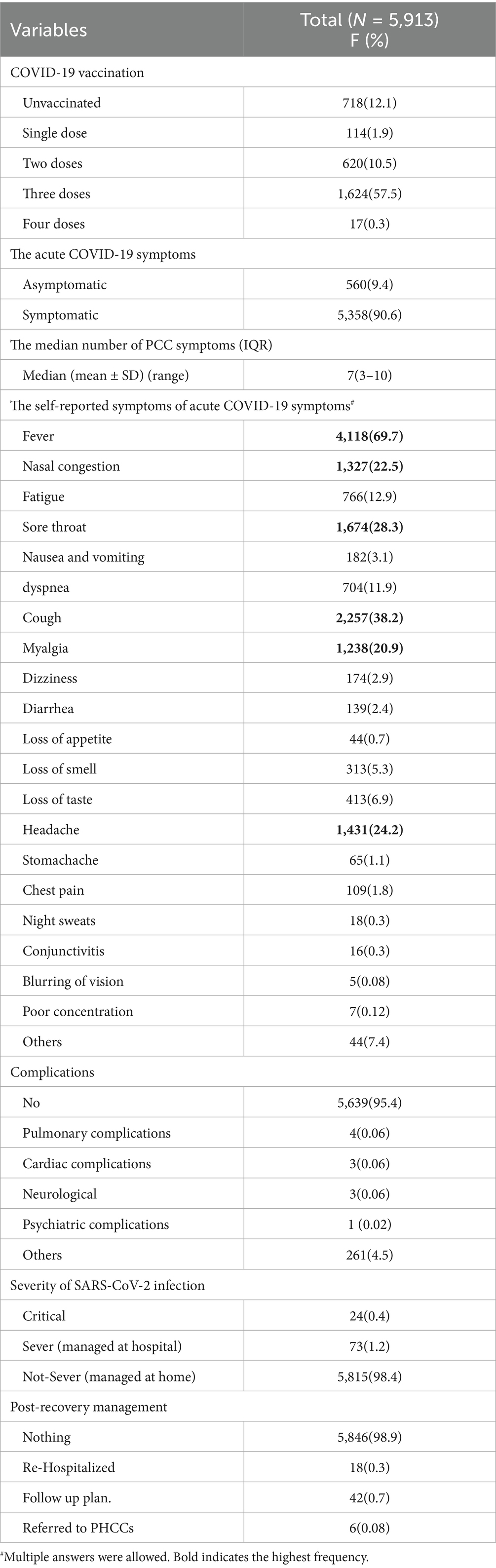 The COVID-19 vaccine’s history and the acute symptoms of the virus (Table 2): Out of the total participants, 1,622 (57.5%) received three doses of the vaccination, while 716 (12.2%) did not receive any vaccination; 5,352 (90.6%) of the participants had symptoms in the majority of cases. Fever (4,118, 69.7%), cough (2,225, 38.2%), sore throat (1,674, 28.3%), headache (1,431, 24.2%), nasal congestion, and myalgia [1238] (20.9%) were the most frequently reported acute COVID-19 symptoms. Merely 63 (1.1%) out of those who reported symptoms required additional treatment (re-hospitalization, follow-up plan, or referral to PHCCs), while 5,813 (98.4%) had complications and were treated at home.
