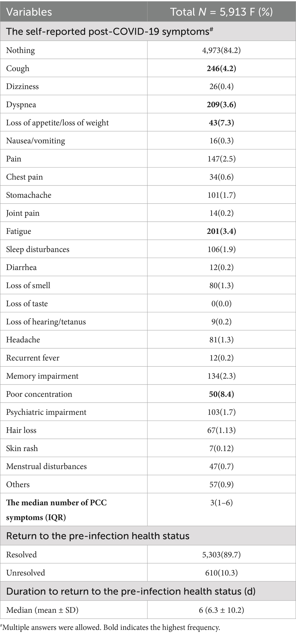 The symptoms that PCCs self-reported, listed in Table 3: While 5,301 (89.7%) of the cases stated that their health had returned to before the infection, there was a notable decrease in the median number of symptoms from seven (IQR 3–10) at the beginning of the disease to three (IQR 1–6) after 4 weeks (p = 0.001), showing a significant and somewhat positive correlation (r = 0.61, p = 0.001) between the two. The majority of participants (4,973, 84.2%) did not report any PCCs, and the most common symptoms were fatigue (201, 3.4%), cough (246, 4.2%), dyspnea (209, 3.6%), loss of appetite or weight loss (43, 7.3%), and poor concentration (50, 8.4%).