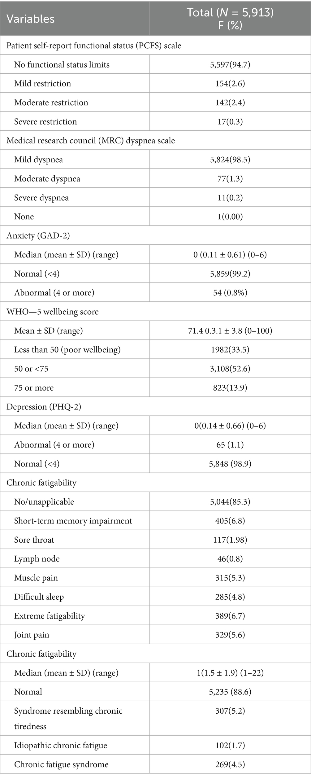 The PCCs’ clinical assessment (Table 4): The majority of cases reported the following at least 4 weeks after the infection began: There were no functional status limitations in PCFS (5,596, or 94.7%), mild dyspnea in MRC (5,822, or 98.5%), moderate to severe dyspnea in 86 (1.5%), and normal chronic fatigue in PCFS (5,234, or 88.6%); a syndrome resembling chronic tiredness was present in 306 (5.2%), and a diagnosis of chronic fatigue syndrome was made in 68 (4.5%) cases. Only 821 people, or 13.9%, reported having good mental wellbeing in 1981, while 63 people (1.1%) reported having an abnormal PHQ-2 depression scale and 52 people (0.8%) reported having an abnormal GAD-2 anxiety scale.