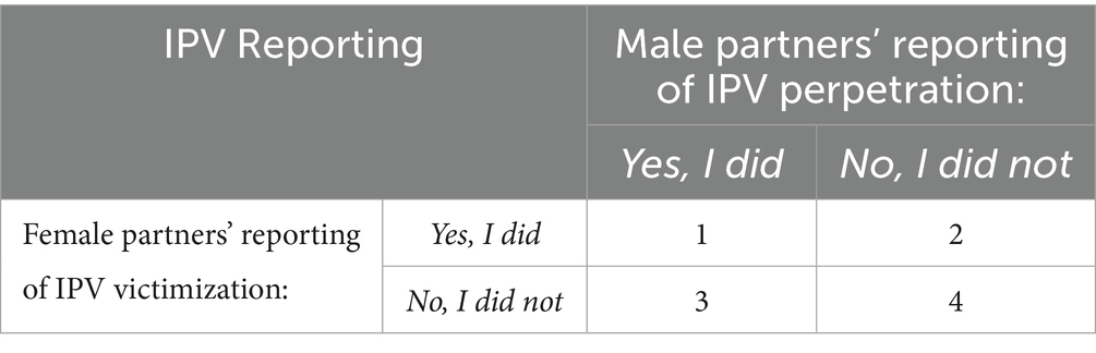 Ethically collected self-reported data from female (f) on IPV victimization and from male (m) partners on perpetration, respectively, can help address unreported IPV (7, 8). A woman’s report that she has experienced IPV is a well-established indicator of her IPV victimization (Table 1, Cells 1 and 2) in IPV research (1, 9–11), regardless of whether her male partner agrees (Table 1, Cell 1, yes–yes concordance from now on) or disagrees (Cell 2, yes–no discordance from now on) with her report. Similarly, a man’s report of his IPV perpetration is a well-established indicator of his IPV perpetration and his female partner’s IPV victimization (Cells 1 and 3) (12), regardless of whether his female partner agrees (Cell 1, yes–yes concordance) or disagrees (Cell 3, no–yes discordance from now on) with his report. Therefore, leveraging discordance in IPV reporting within couples (8, 13) allows researchers to identify more women experiencing IPV by using reports from both partners rather than relying solely on women’s reports.