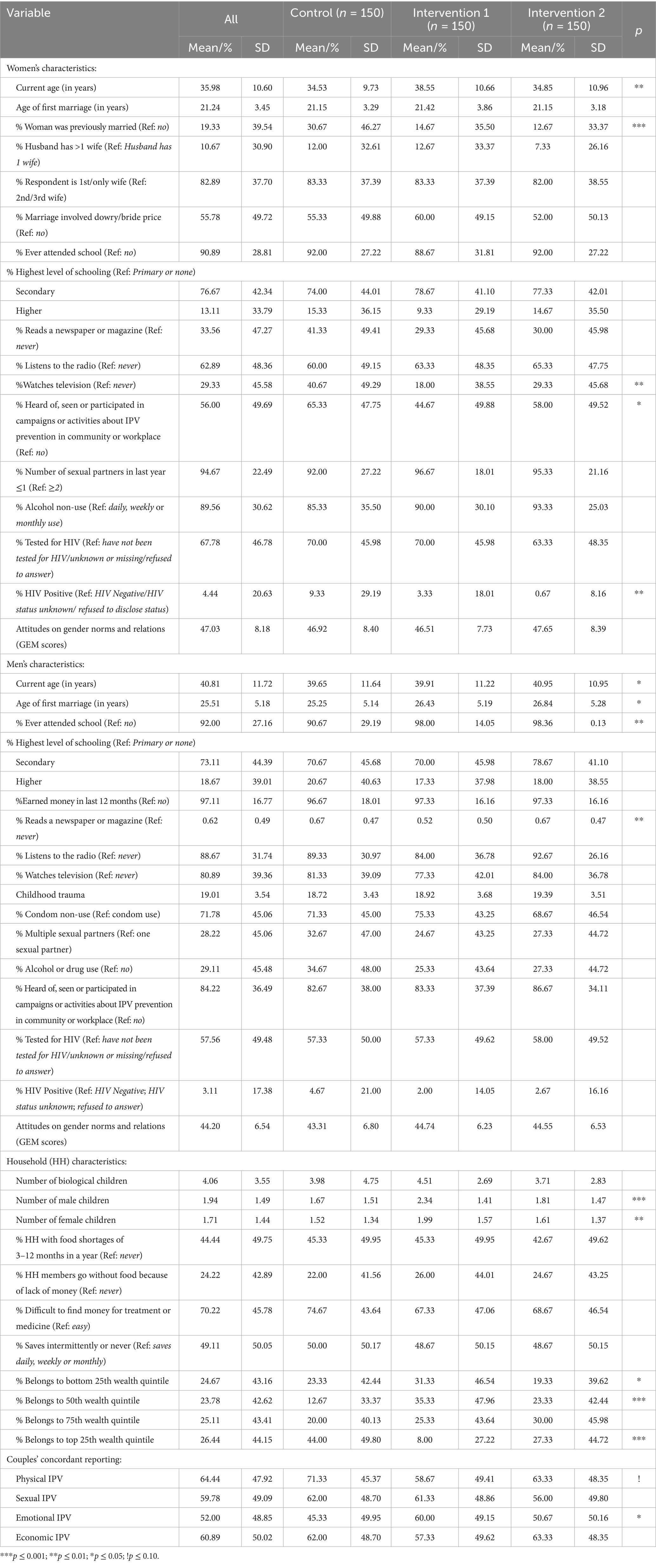 Table 2. Baseline characteristics in women, men and households across study arms, n = 450 couples, Tanzania, 2015–2016.