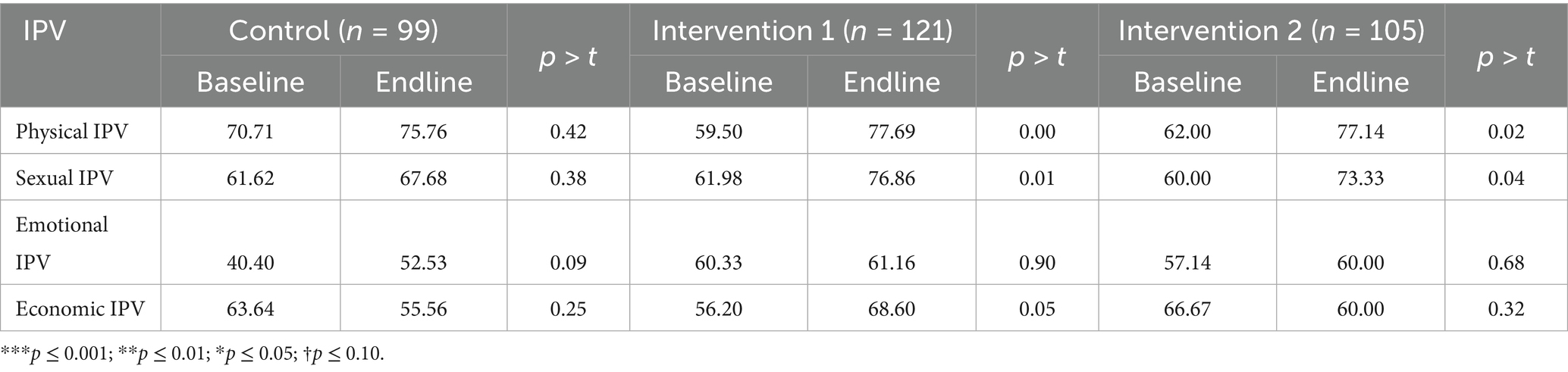 From baseline to endline, concordant reporting of emotional IPV increased by 1% in Intervention Arm 1 (p = 0.90), 5% in Intervention Arm 2 (p = 0.68), and 30% in Control Arm (p = 0.09).