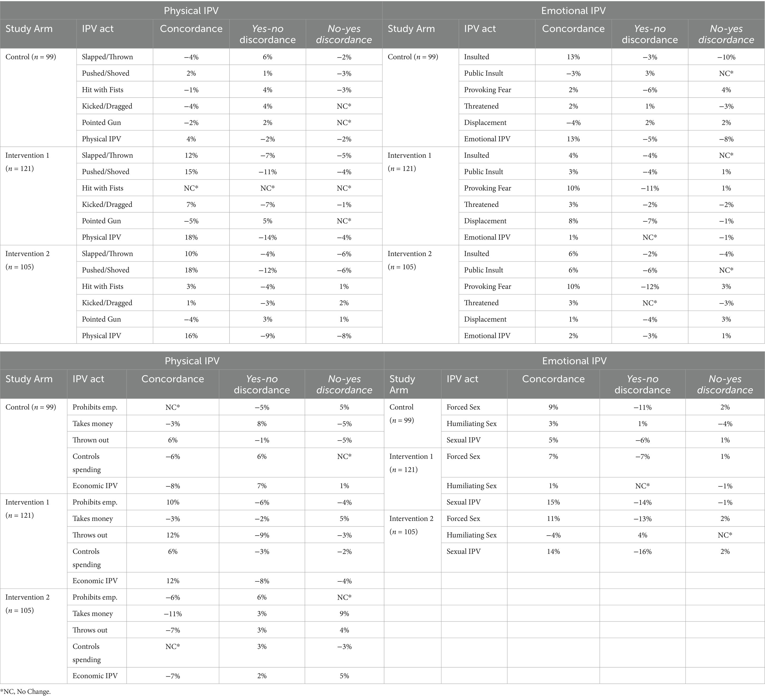 Finally, for each type of IPV, we constructed a change variable: Couples received a value of 1 if they reported concordantly at endline and discordantly at baseline; otherwise, couples received a value of 0.