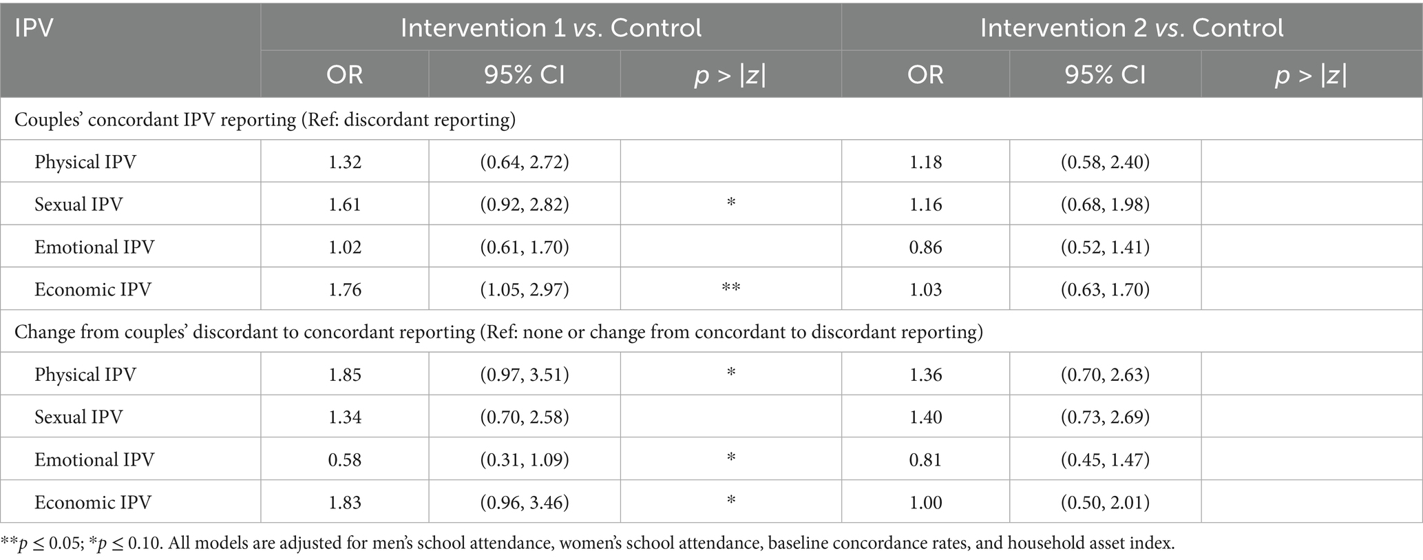 Table 4 presents results from two regression analyses: (1) comparing couples’ concordant reporting at the endline, by study arms, and (2) comparing changes from discordant to concordant reporting between baseline and endline by study arm. Compared to couples in the Control Arm, those in Intervention Arm 1 had higher odds of reporting concordantly on physical (OR: 1.32; p = 0.45), sexual (OR: 1.61; p = 0.095), emotional (OR: 1.02; p = 0.94), and economic IPV (OR: 1.76; p = 0.03), at the endline. In addition, compared to couples in the Control Arm, those in Intervention Arm 2 had higher odds of reporting concordantly on physical (OR: 1.18; p = 0.65), sexual (OR: 1.16; p = 0.58), and economic IPV (OR = 1.03; p = 0.92), and lower odds of reporting concordantly on emotional IPV (OR: 0.86; p = 0.54). Furthermore, compared to couples in the Control Arm, those in Intervention Arm 1 had a higher odds of changing from discordant to concordant reporting between the baseline and the endline on physical (OR: 1.85; p = 0.06), sexual (OR: 1.34; p = 0.38), and economic (OR: 1.83; p = 0.07) IPV, and had a lower odds of changing from discordant to concordant reporting between the baseline and the endline on emotional IPV (OR:0.58; p = 0.09). Interestingly, couples in Intervention Arm 2 were comparable to Control couples in terms of their odds of changing from discordant to concordant reporting between the baseline and the endline.