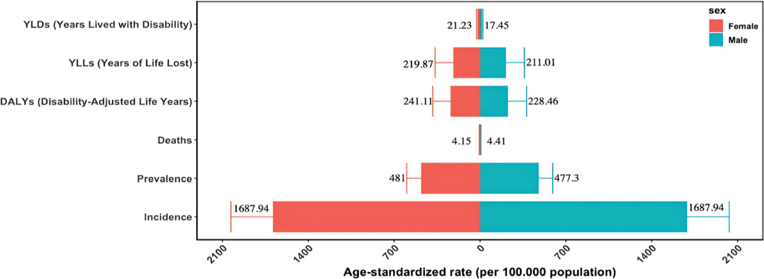 10. GBD 2021 Diseases and Injuries Collaborators. Global incidence, prevalence, years lived with disability (YLDs), disability-adjusted life-years (DALYs), and healthy life expectancy (HALE) for 371 diseases and injuries in 204 countries and territories and 811 subnational locations, 1990-2021: a systematic analysis for the global burden of disease Study2021. Lancet. (2024) 403:2133–61. doi: 10.1016/S0140-6736(24)00757-8