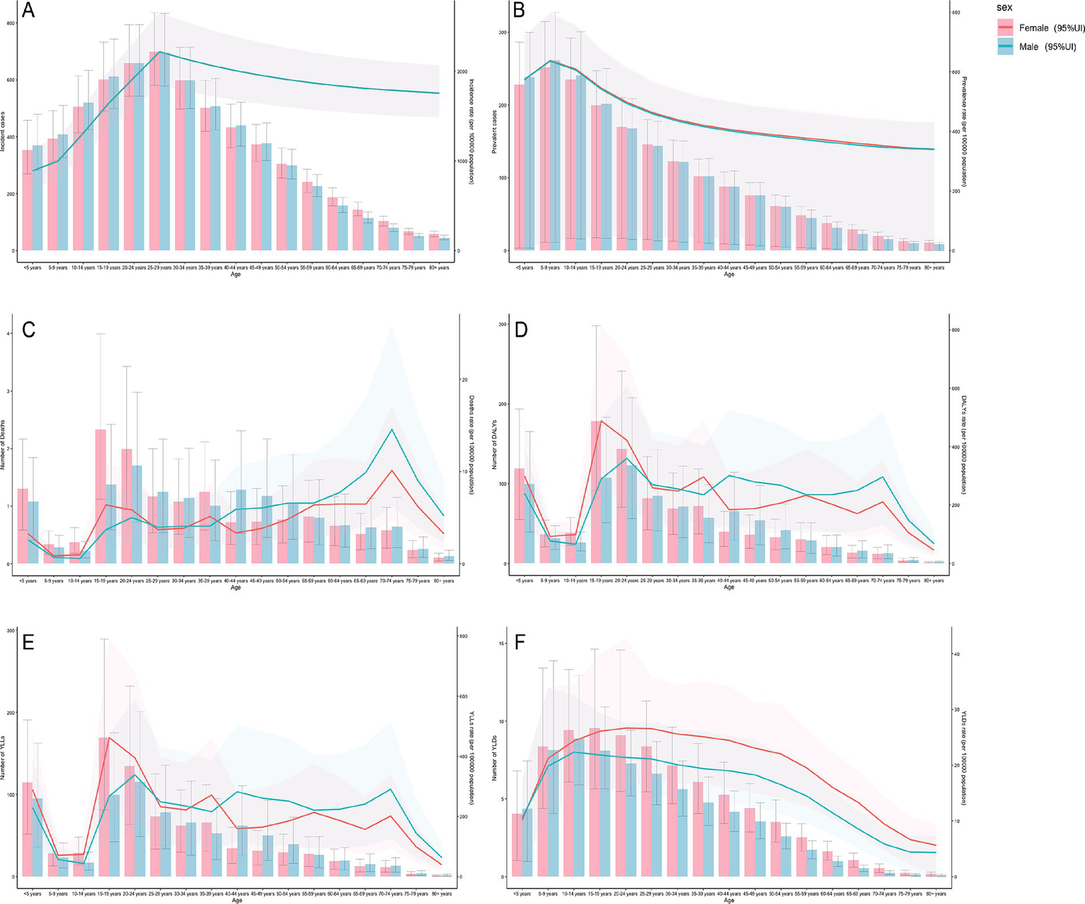 Figure 2. Gender disparities in the burden of malaria in different age groups. (A) Incidence. (B) Prevalence. (C) Mortality. (D) DALYs (disability-adjusted life years). (E) YLLs (years of life lost). (F) YLDs (years lived with disability). 95%Ul, 95% uncertainty interval.