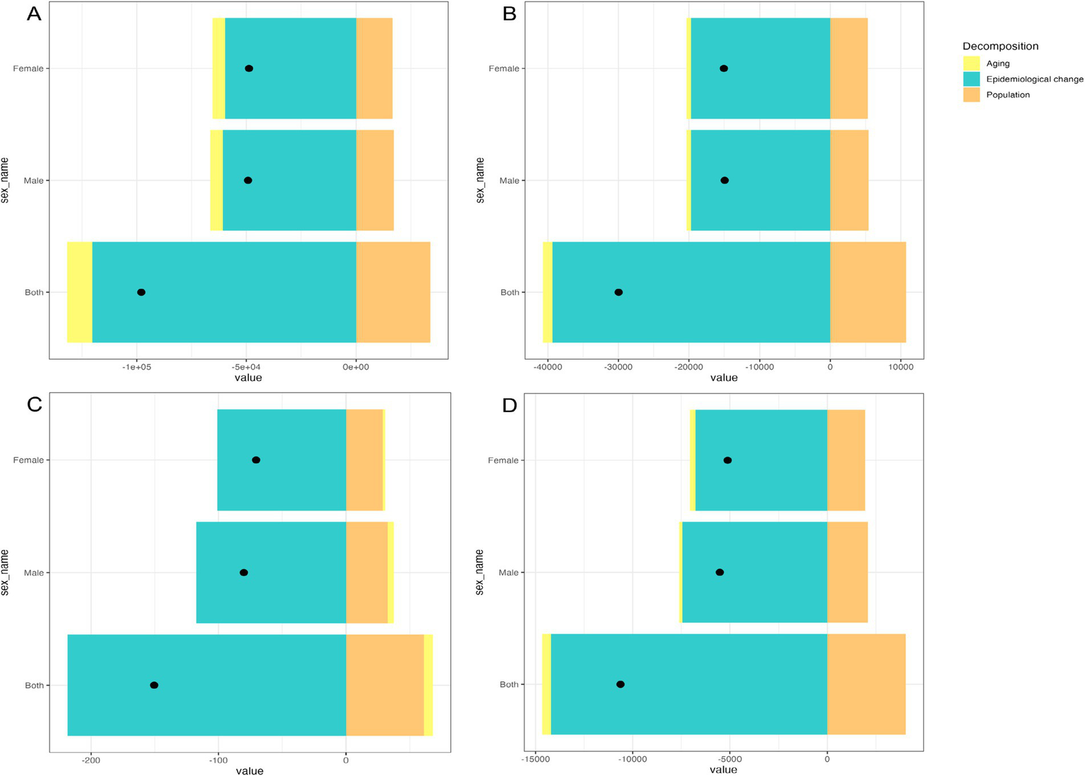 Figure 3. Decomposition analysis of the malaria burden in the Comoros (1990 to 2021): (A) Incidence. (B) Prevalence. (C) Deaths. (D) DALYs (disability-adjusted life years). The black dot indicates the overall change attributable to aging, population growth, and epidemiological shifts.