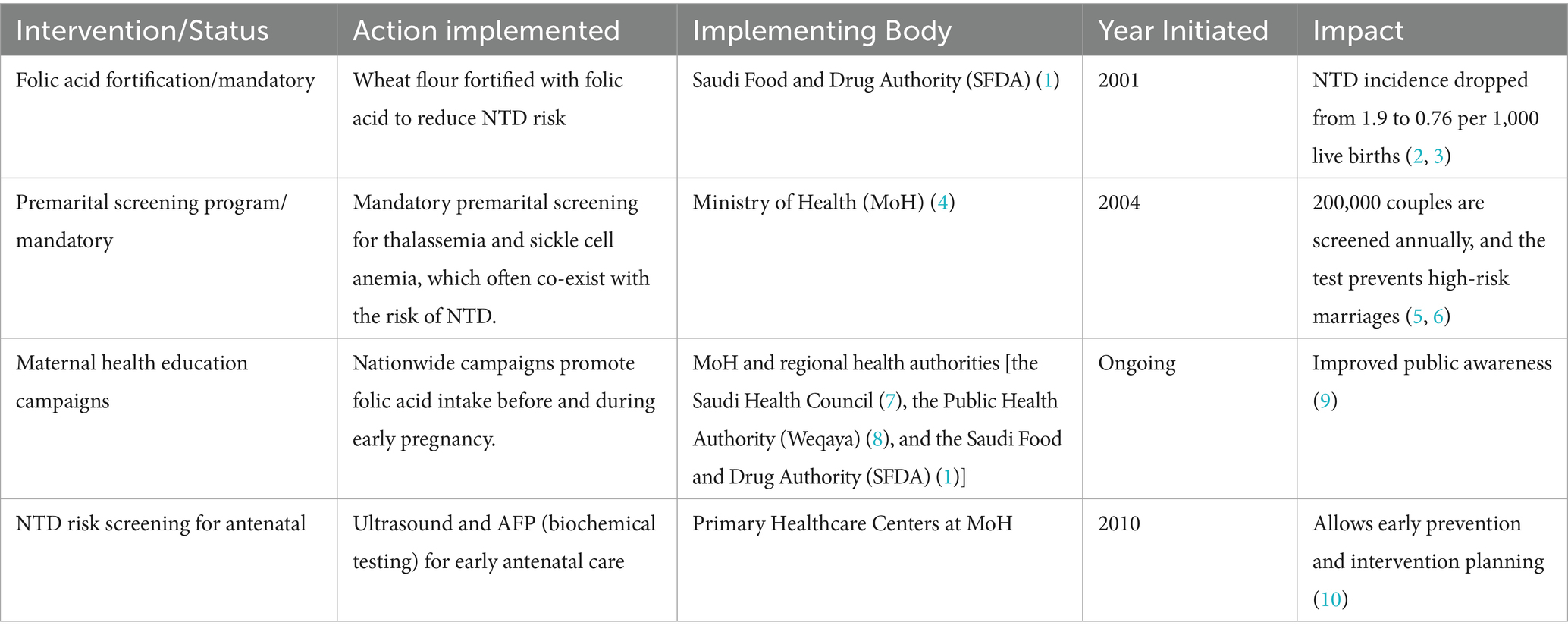 Various health interventions have been introduced worldwide and in Saudi Arabia to prevent NTDs, including ultrasound, prenatal screening, and adding 400 g of folic acid to the daily diet, which has greatly reduced NTDs in newborns (68–71). However, the recent decline in NTD rates in Saudi Arabia is thought to be due to several different factors (70). A key factor in reducing NTDs in Saudi Arabia is widespread folic acid supplementation among women of reproductive age (70). Additionally, fortification programs have shown significant reductions in NTD rates (70). The country’s young population also helps, as women under 25 are generally at a lower risk of having babies with NTDs compared to women over 35 (71). Mothers under 25 years face a slightly increased risk of NTDs due to behavioral factors or modifiable nutritional not biological age. These factors include low folic acid intake, unplanned pregnancies, inadequate diets, and micronutrient deficiencies, e.g., iron and vitamin B12. Further Socioeconomic challenges, education, and limited healthcare access compound these risks (22, 72–74), while women over 35 have a higher risk of NTDs due to age-related metabolic instability and comorbidities like obesity and diabetes (73). Represented by the MOH, the government of Saudi Arabia has worked through the years on several initiatives to prevent NTDs, as illustrated in the timeline summary in Table 2 (75–83). The Saudi Ministry of Health (MoH) has worked hard to raise awareness about folic acid supplementation. Their website provides clear guidelines on daily folic acid intake: 400 μg for normal-risk women before and during pregnancy (up to 12 weeks) and 5 mg for high-risk women (such as those on antiepileptic or antidiabetic drugs, or with a history of neural tube defects). A study by Alreshidi et al. found that 67.5% of pregnant women in Saudi Arabia received information on folic acid from their healthcare provider, and 80.1% were aware that it prevents NTDs (84). The MOH has also introduced prenatal ultrasound screening and a strategy to fortify specific foods with folic acid (77, 85). Genetic counseling is offered to couples, given the region’s high rates of consanguinity (75). Additionally, regular training for healthcare workers helps improve their ability to diagnose and manage NTDs (86).