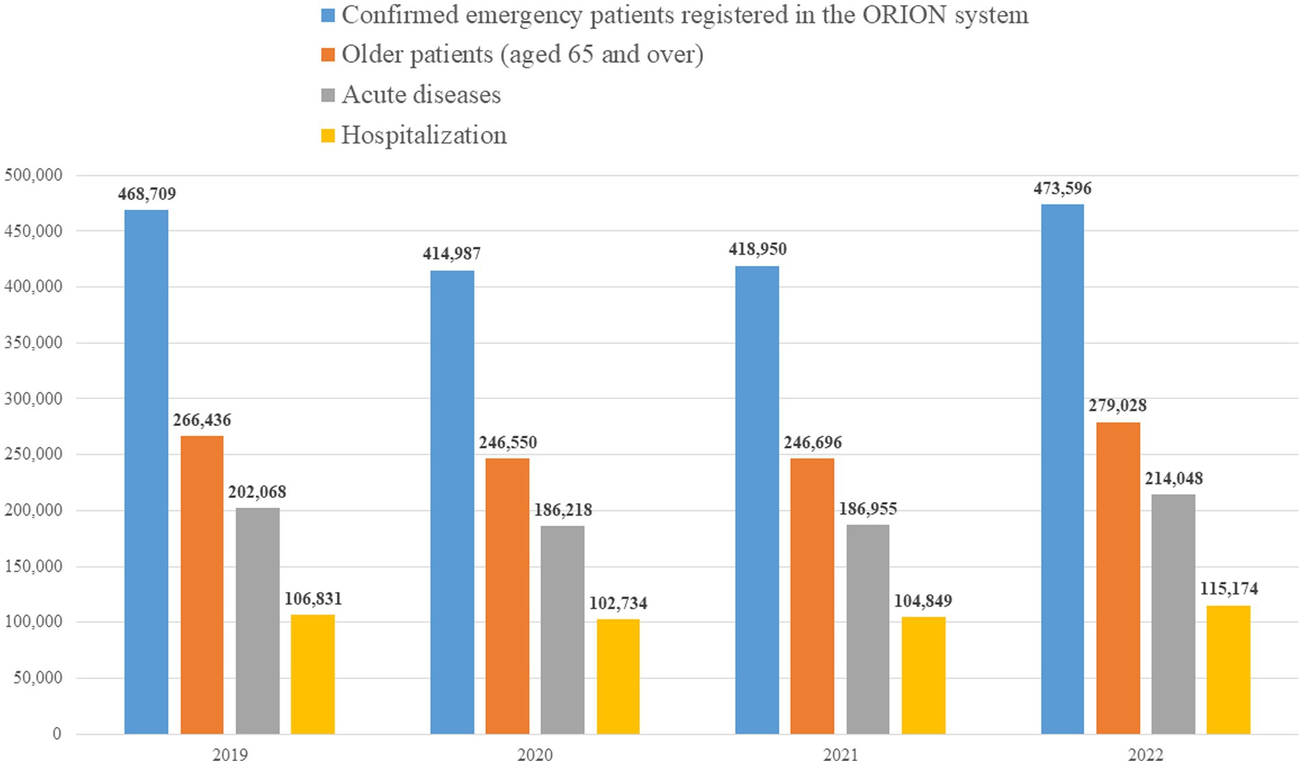 This was a descriptive retrospective study with a period spanning January 1, 2019, to December 31, 2022. We used the database of the population-based registry of emergency department patients, comprising both ambulance and in-hospital records managed by ORION. This database is operated by Osaka Prefecture and covers all patients transported to critical care centers and emergency hospitals in the prefecture. Information concerning the ORION database has been previously described in detail (14, 15). Briefly, the ambulance crew at the scene operate the ORION smartphone application for each emergency patient. All data entered into the mobile app are recorded, including vital signs and the time between receipt of the request and admission to the hospital. The smartphone app data are then stored on the ORION cloud server. Cooperating with the dispatched ambulance crew, the data manager at each fire department directly enters and uploads the ambulance records for each emergency patient, which can then be linked to the app data. Operators at each hospital also directly input or upload patient data, such as diagnoses and outcomes, after patients are admitted, and the results compiled by the ORION system are fed back to each fire department and emergency hospital. The ORION system is installed in all fire departments and emergency hospitals in Osaka Prefecture. Its data are administrative records that are anonymized without specific personal information such as patient names, birth dates, and addresses. Therefore, the requirement to obtain informed patient consent was waived for this study. This study was approved by the ethics committee of Osaka University Graduate School of Medicine (approval no.: 15003). All procedures were conducted in accordance with the Declaration of Helsinki.