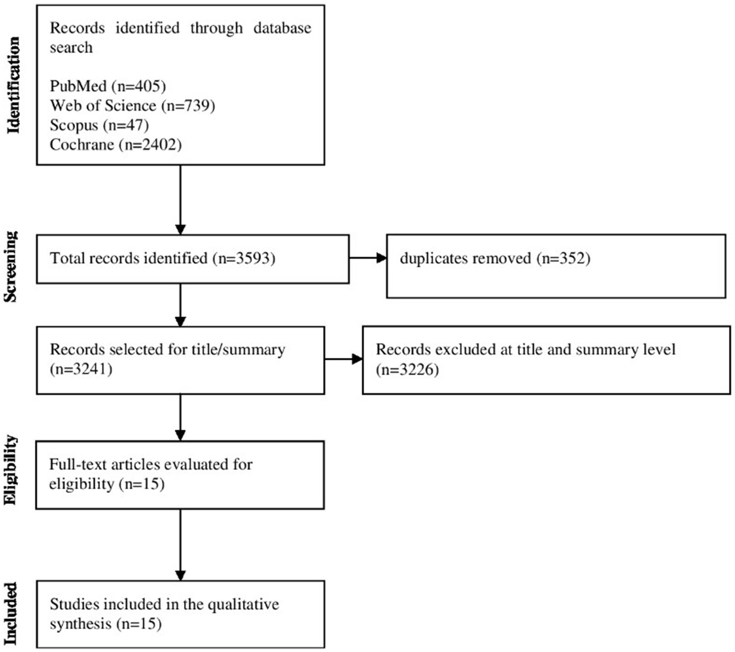 3,593 articles were identified using the search strategies in the electronic databases, and the articles were exported to Rayyan, removing duplicates (nâŻ=âŻ352). The titles, followed by the abstracts, were analyzed according to the inclusion criteria and the PICOS strategy, and 3,226 articles were excluded. Due to the use of a broad search strategy in the databases, the use of exclusion criteria of RCT studies, and the publication period within the last 5âŻyears, the number of exclusions was significant at this screening stage. The final sample consisted of 15 articles that were selected for full reading. Figure 1 shows the flowchart of the article screening and selection process.