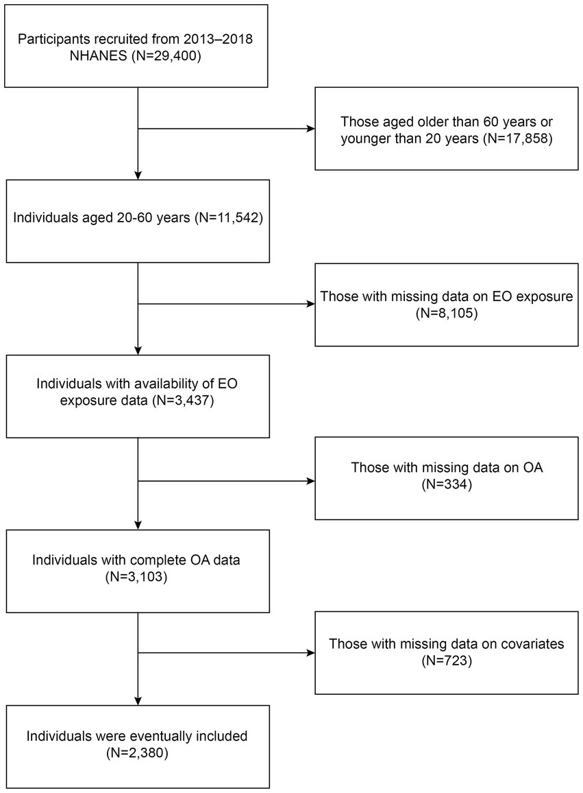 In the present study, we utilized cross-sectional data from the 2013–2018 National Health and Nutrition Examination Survey (NHANES). The NHANES is a nationwide program conducted by the National Center for Health Statistics (NCHS) to assess the nutritional and health conditions of Americans. Five types of data are included in the NHANES: demographic, examination, dietary, laboratory, and questionnaire data. The NCHS Research Ethics Review Board approved the entire program, and all participants provided written informed consent. The flowchart of the study is shown in Figure 1. Initially, a cohort of 29,400 participants from 2013 to 2018 NHANES were recruited. After excluding individuals older than 60 years or younger than 20 years (N = 17,858), those with missing data on EO exposure (N = 8,105), those with missing data on OA (N = 334), and those with missing data on covariates (N = 723), 2,380 individuals were eventually included.
